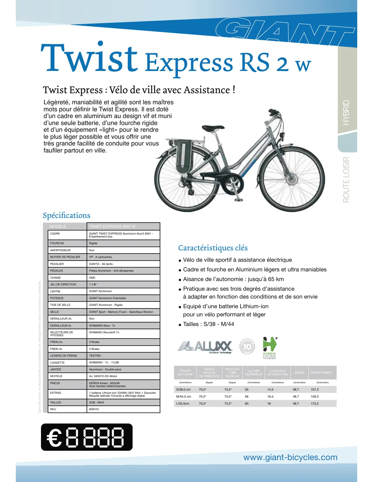 | Caractéristiques techniques principales | Cadre en aluminium, moteur situé dans le moyeu arrière |