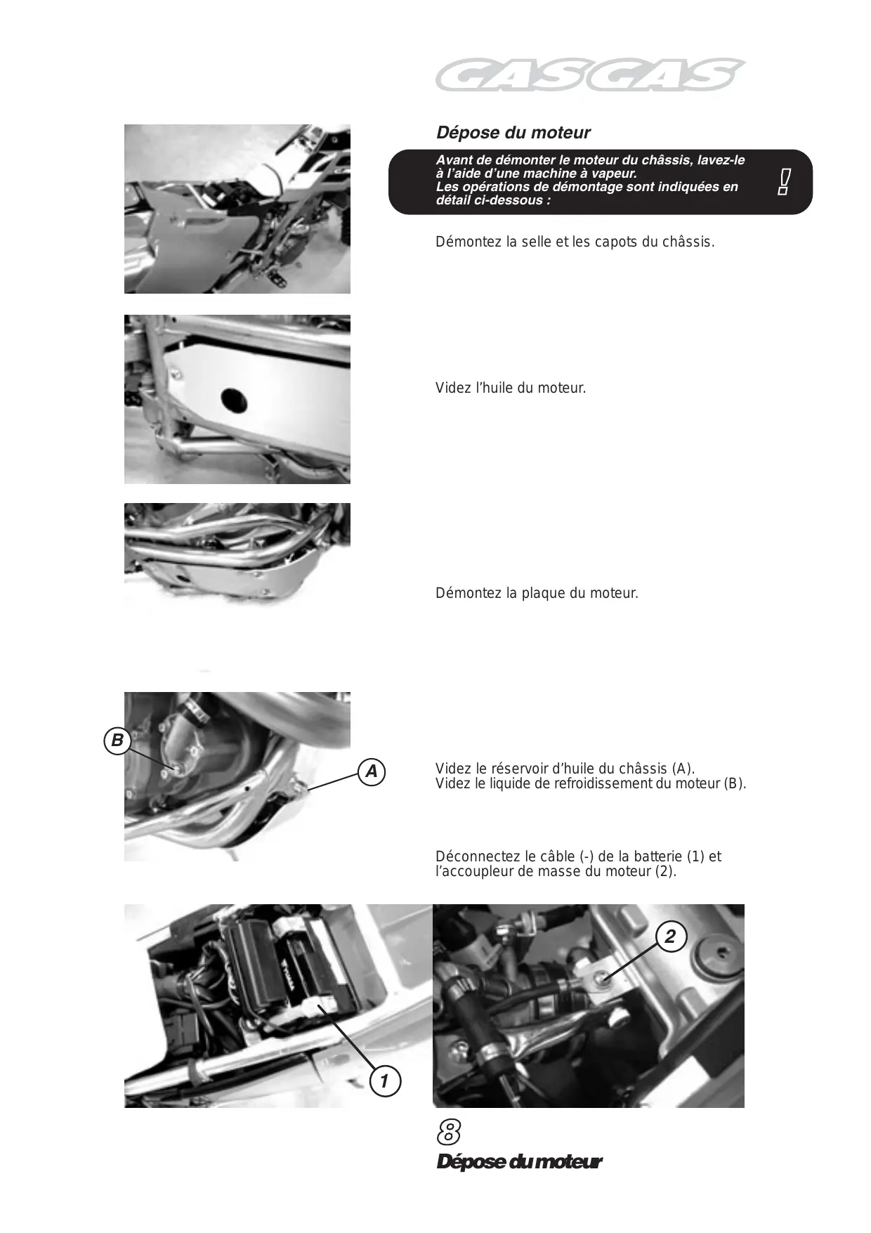 Dépose du moteur Dépose du moteur Avant de démonter le moteur du châssis, lavez-le à l’aide d’une machine à vapeur. Les opérations de démontage sont indiquées en détail ci-dessous : Démontez la selle et les capots du châssis. Videz l’huile du moteur. Démontez la plaque du moteur.