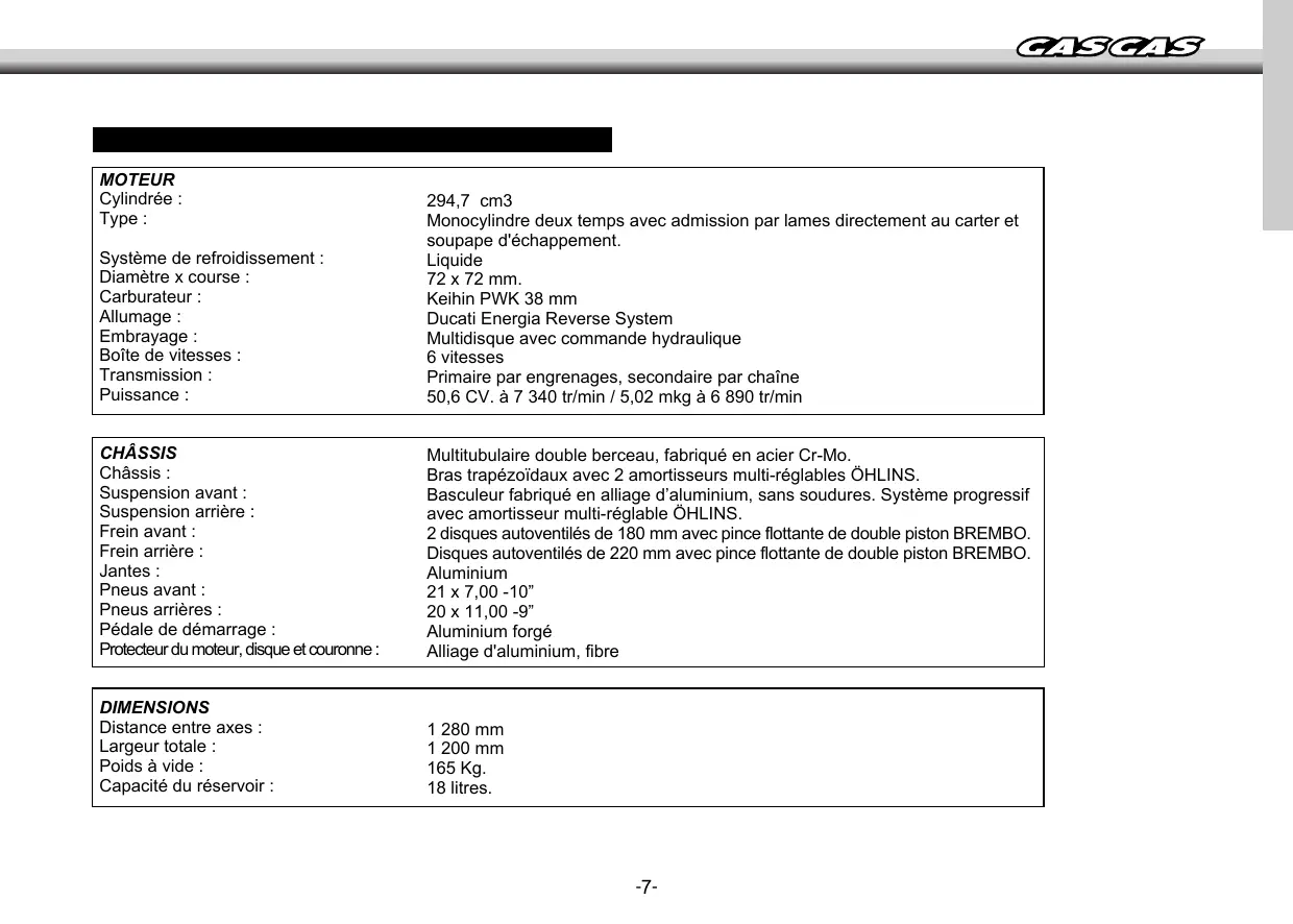 MANUAL MANUAL DEL DEL USUARIO USUARIO SERVICE SERVICE MANUAL MANUAL MANUEL MANUEL D’ENTRETIEN D’ENTRETIEN LIBRETTO LIBRETTO D´USO D´USO FRANÇAIS GUIDE DE L’UTILISATEUR PRÉSENTATION GAS GAS vous remercie de votre confiance. En choisissant le nouveau WILD H.P. 300 RV, vous venez d’entrer dans la grande famille GAS GAS et en qualité d'utilisateur de la marque numéro un en motos tout terrain, vous méritez toute notre attention que ce soit pour notre relation après-vente ou pour les informations que nous vous offrons dans ce manuel. Notre WILD H.P. 300. RV est un quadricycle sportif conçu par et pour la compétition. Il vous permettra d’apprécier le haut degré de perfection technique et de fiabilité ainsi qu’un design soigné et de grandes prestations. Ce manuel vous fournira une bonne connaissance de base des caractéristiques et du maniement de la machine. Il contient également des indications importantes concernant la sécurité et apporte des informations sur les techniques et les habilités spécifiques nécessaires pour conduire la machine, ainsi que sur les principales procédures d’entretien et d’inspection. Nous vous remercions de votre confiance, et vous souhaitons la bienvenue à GAS GAS Motos.