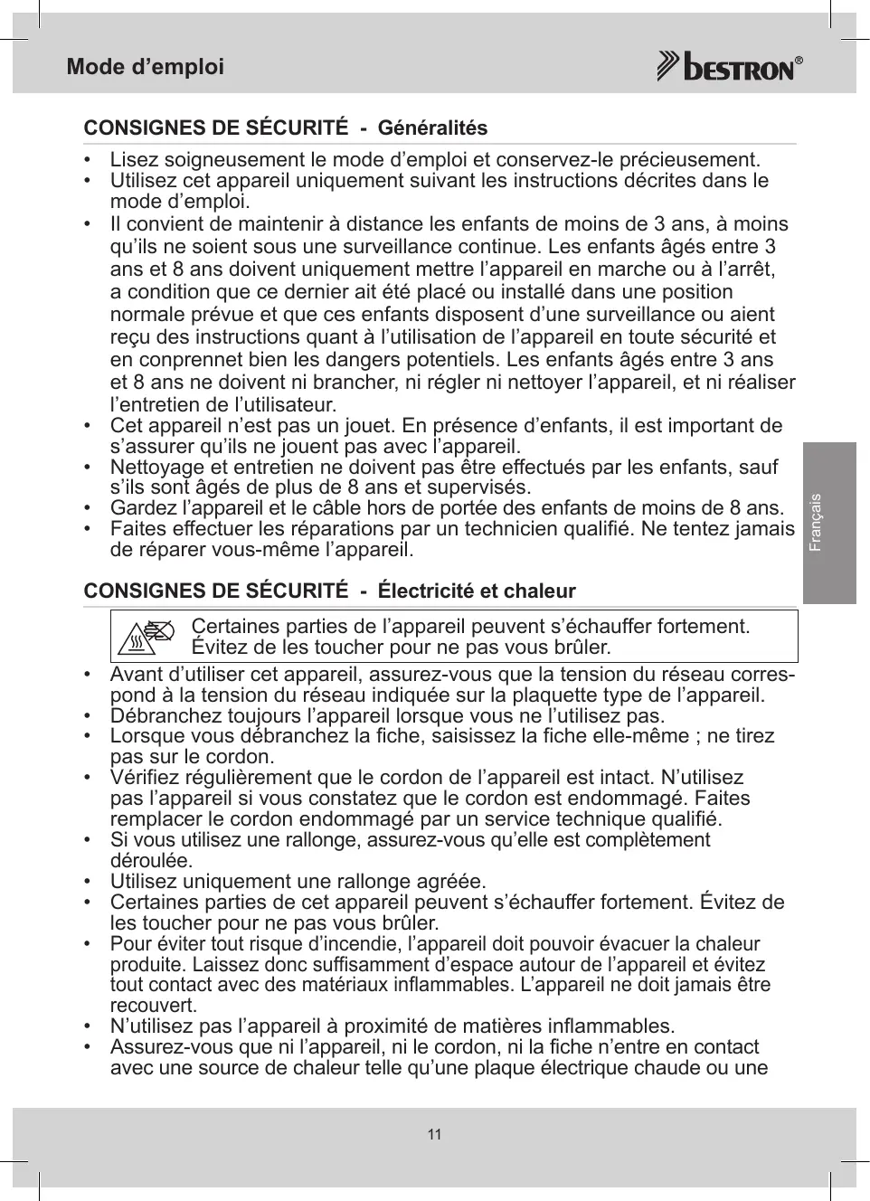 Retrouvez gratuitement la notice de l'appareil AFH211B BESTRON au format PDF.