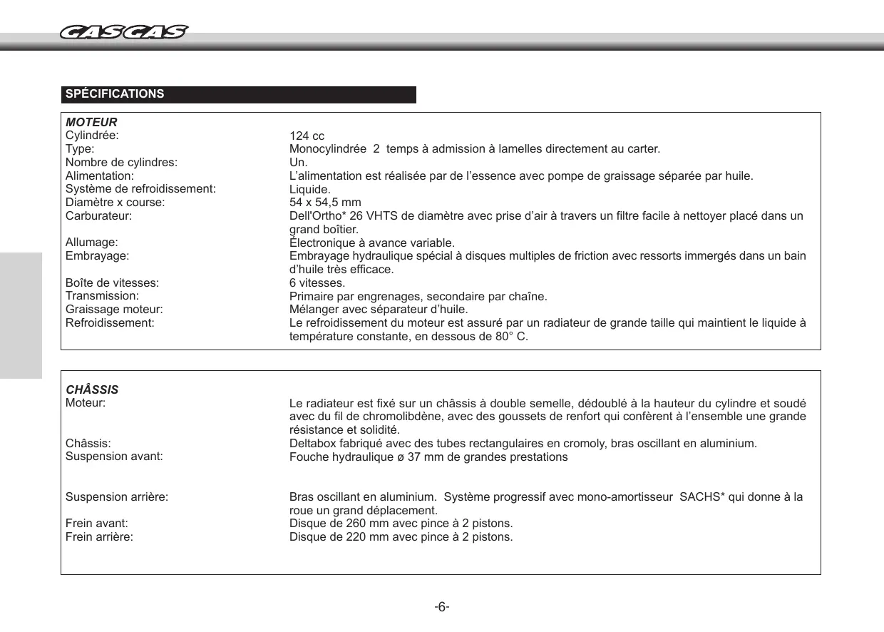 SPÉCIFICATIONS MOTEUR Cylindrée: Type: Nombre de cylindres: Alimentation: Système de refroidissement: Diamètre x course: Carburateur: Allumage: Embrayage: Boîte de vitesses: Transmission: Graissage moteur: Refroidissement: CHÂSSIS Moteur: Châssis: Suspension avant: Suspension arrière: Frein avant: Frein arrière: 124 cc Monocylindrée 2 temps à admission à lamelles directement au carter. Un. L’alimentation est réalisée par de l’essence avec pompe de graissage séparée par huile. Liquide. 54 x 54,5 mm Dell'Ortho* 26 VHTS de diamètre avec prise d’air à travers un filtre facile à nettoyer placé dans un grand boîtier. Électronique à avance variable. Embrayage hydraulique spécial à disques multiples de friction avec ressorts immergés dans un bain d’huile très efficace. 6 vitesses. Primaire par engrenages, secondaire par chaîne. Mélanger avec séparateur d’huile. Le refroidissement du moteur est assuré par un radiateur de grande taille qui maintient le liquide à température constante, en dessous de 80° C. Le radiateur est fixé sur un châssis à double semelle, dédoublé à la hauteur du cylindre et soudé avec du fil de chromolibdène, avec des goussets de renfort qui confèrent à l’ensemble une grande résistance et solidité. Deltabox fabriqué avec des tubes rectangulaires en cromoly, bras oscillant en aluminium. Fouche hydraulique ø 37 mm de grandes prestations Bras oscillant en aluminium. Système progressif avec mono-amortisseur SACHS* qui donne à la roue un grand déplacement. Disque de 260 mm avec pince à 2 pistons. Disque de 220 mm avec pince à 2 pistons.