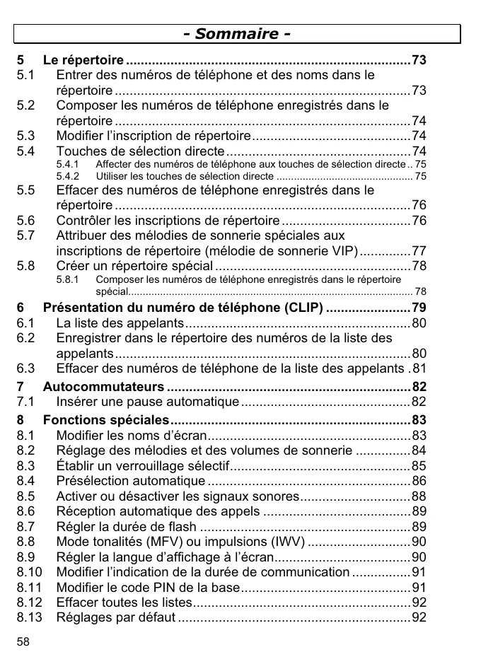 7.1 Insérer une pause automatique 82 8.1 Modifier les noms d'écran 83 8.2 Réglage des mélodies et des volumes de sonnerie 84 8.3 Établir un verrouillage sélectif 85 8.4 Présélection automatique 86 8.5 Activer ou désactiver les signaux sonores 88 8.6 Réception automatique des appels 89 8.7 Régler la durée de flash 89 8.8 Mode tonalités (MFV) ou impulsions (IWV) 90 8.9 Régler la langue d'affichage à l'écran 90 8.10 Modifier l'indication de la durée de communication 91 8.11 Modifier le code PIN de la base 91 8.12 Effacer toutes les listes 92 8.13 Réglages par défaut 92