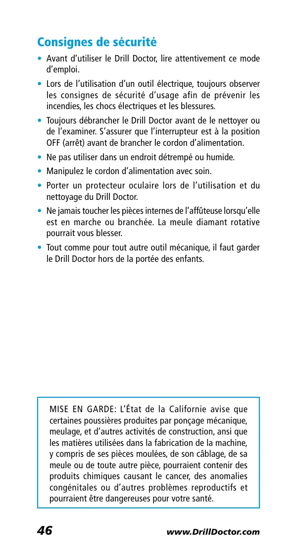 - Tout comme pour tout autre outil mécanique, il faut garder le Drill Doctor hors de la portée des enfants. MISE EN GARDE: L’État de la Californie avise que certaines poussières produites par ponçage mécanique, meulage, et d’autres activités de construction, ansi que les matières utilisées dans la fabrication de la machine, y compris de ses pièces moulées, de son câblage, de sa meule ou de toute autre pièce, pourraient contenir des produits chimiques causant le cancer, des anomalies congénitales ou d’autres problèmes reproductifs et pourraient être dangereuses pour votre santé.