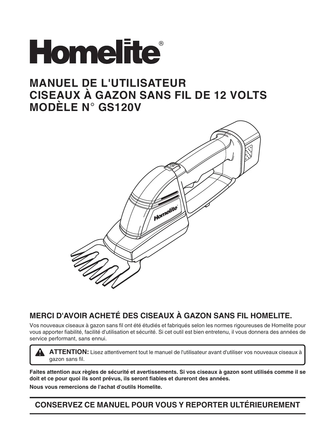 MERCI D'AVOIR ACHETÉ DES CISEAUX À GAZON SANS FIL HOMELITE. Vos nouveaux ciseaux à gazon sans fil ont été étudiés et fabriqués selon les normes rigoureuses de Homelite pour vous apporter fiabilité, facilité d'utilisation et sécurité. Si cet outil est bien entretenu, il vous donnera des années de service performant, sans ennui. ATTENTION: Lisez attentivement tout le manuel de l'utilisateur avant d'utiliser vos nouveaux ciseaux à gazon sans fil. Faites attention aux règles de sécurité et avertissements. Si vos ciseaux à gazon sont utilisés comme il se doit et ce pour quoi ils sont prévus, ils seront fiables et dureront des années. Nous vous remercions de l'achat d'outils Homelite. CONSERVEZ CE MANUEL POUR VOUS Y REPORTER ULTÉRIEUREMENT