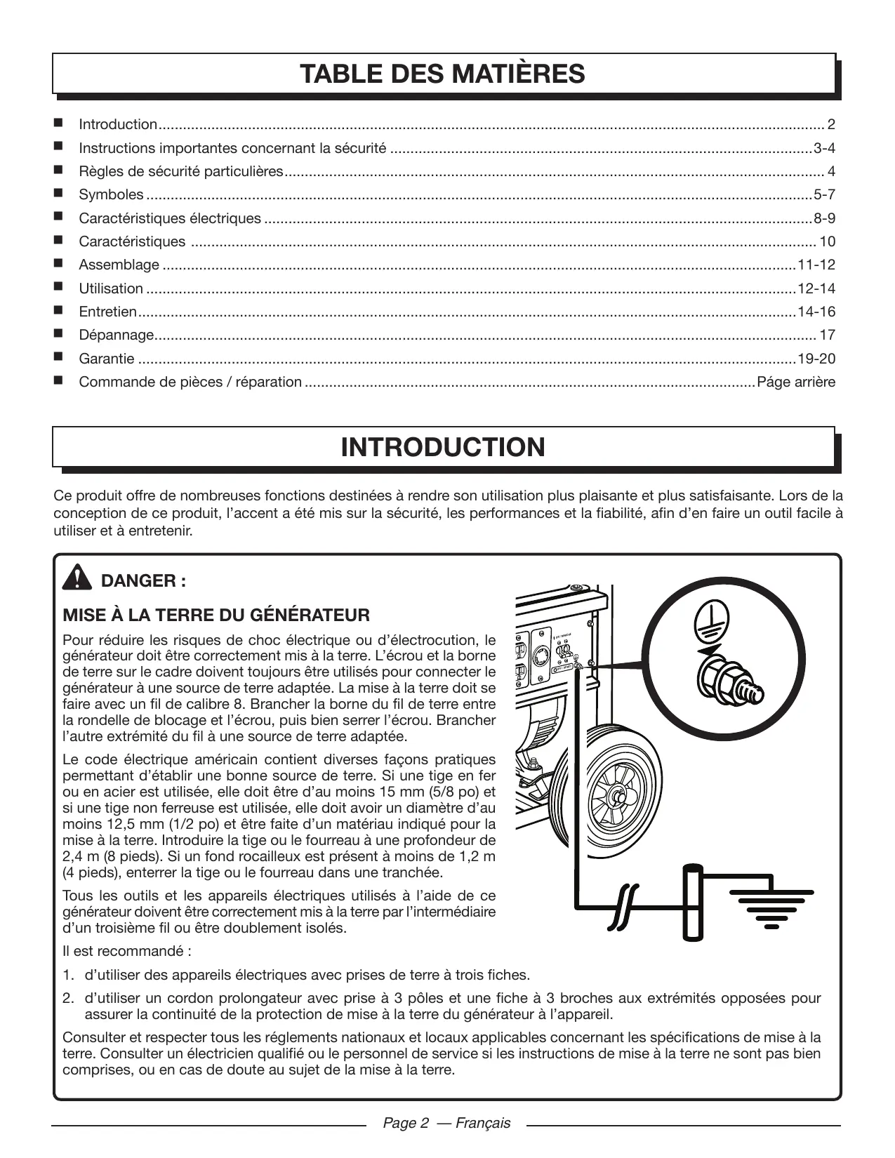 assurer la continuité de la protection de mise à la terre du générateur à l’appareil. Consulter et respecter tous les réglements nationaux et locaux applicables concernant les spécifications de mise à la terre. Consulter un électricien qualifié ou le personnel de service si les instructions de mise à la terre ne sont pas bien comprises, ou en cas de doute au sujet de la mise à la terre. Page 2 — Français