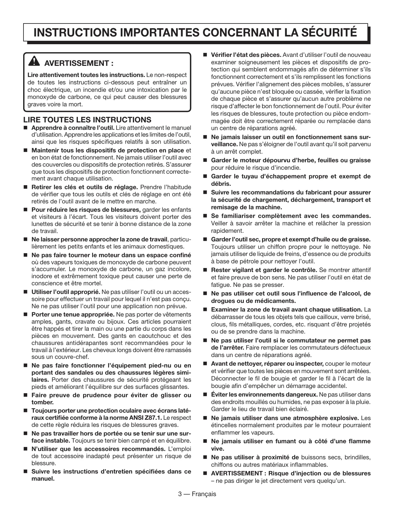 Lire attentivement toutes les instructions. Le non-respect de toutes les instructions ci-dessous peut entraîner un choc électrique, un incendie et/ou une intoxication par le monoxyde de carbone, ce qui peut causer des blessures graves voire la mort. Apprendre à connaître l’outil. Lire attentivement le manuel d’utilisation. Apprendre les applications et les limites de l’outil, ainsi que les risques spécifiques relatifs à son utilisation. Maintenir tous les dispositifs de protection en place et en bon état de fonctionnement. Ne jamais utiliser l’outil avec des couvercles ou dispositifs de protection retirés. S’assurer que tous les dispositifs de protection fonctionnent correctement avant chaque utilisation. Retirer les clés et outils de réglage. Prendre l’habitude de vérifier que tous les outils et clés de réglage en ont été retirés de l’outil avant de le mettre en marche. Pour réduire les risques de blessures, garder les enfants et visiteurs à l’écart. Tous les visiteurs doivent porter des lunettes de sécurité et se tenir à bonne distance de la zone de travail. Ne laisser personne approcher la zone de travail, particulièrement les petits enfants et les animaux domestiques. Ne pas faire tourner le moteur dans un espace confiné où des vapeurs toxiques de monoxyde de carbone peuvent s’accumuler. Le monoxyde de carbone, un gaz incolore, inodore et extrêmement toxique peut causer une perte de conscience et être mortel. Utiliser l’outil approprié. Ne pas utiliser l’outil ou un accessoire pour effectuer un travail pour lequel il n’est pas conçu. Ne ne pas utiliser l’outil pour une application non prévue. Porter une tenue appropriée. Ne pas porter de vêtements amples, gants, cravate ou bijoux. Ces articles pourraient être happés et tirer la main ou une partie du corps dans les pièces en mouvement. Des gants en caoutchouc et des chaussures antidérapantes sont recommandées pour le travail à l’extérieur. Les cheveux longs doivent être ramassés sous un couvre-chef. Ne pas faire fonctionner l’équipement pied-nu ou en portant des sandales ou des chaussures légères similaires. Porter des chaussures de sécurité protégeant les pieds et améliorant l’équilibre sur des surfaces glissantes. Faire preuve de prudence pour éviter de glisser ou tomber. Toujours porter une protection oculaire avec écrans latéraux certifiée conforme à la norme ANSI Z87.1. Le respect de cette règle réduira les risques de blessures graves. Ne pas travailler hors de portée ou se tenir sur une surface instable. Toujours se tenir bien campé et en équilibre. N’utiliser que les accessoires recommandés. L’emploi de tout accessoire inadapté peut présenter un risque de blessure. Suivre les instructions d’entretien spécifiées dans ce manuel. Vérifier l’état des pièces. Avant d’utiliser l’outil de nouveau examiner soigneusement les pièces et dispositifs de protection qui semblent endommagés afin de déterminer s’ils fonctionnent correctement et s’ils remplissent les fonctions prévues. Vérifier l’alignement des pièces mobiles, s’assurer qu’aucune pièce n’est bloquée ou cassée, vérifier la fixation de chaque pièce et s’assurer qu’aucun autre problème ne risque d’affecter le bon fonctionnement de l’outil. Pour éviter les risques de blessures, toute protection ou pièce endommagée doit être correctement réparée ou remplacée dans un centre de réparations agréé. Ne jamais laisser un outil en fonctionnement sans surveillance. Ne pas s’éloigner de l’outil avant qu’il soit parvenu à un arrêt complet. Garder le moteur dépourvu d’herbe, feuilles ou graisse pour réduire le risque d’incendie. Garder le tuyau d’échappement propre et exempt de débris. Suivre les recommandations du fabricant pour assurer la sécurité de chargement, déchargement, transport et remisage de la machine. Se familiariser complètement avec les commandes. Veiller à savoir arrêter la machine et relâcher la pression rapidement. Garder l’outil sec, propre et exempt d’huile ou de graisse. Toujours utiliser un chiffon propre pour le nettoyage. Ne jamais utiliser de liquide de freins, d’essence ou de produits à base de pétrole pour nettoyer l’outil. Rester vigilant et garder le contrôle. Se montrer attentif et faire preuve de bon sens. Ne pas utiliser l’outil en état de fatigue. Ne pas se presser. Ne pas utiliser cet outil sous l’influence de l’alcool, de drogues ou de médicaments. Examiner la zone de travail avant chaque utilisation. La débarrasser de tous les objets tels que cailloux, verre brisé, clous, fils métalliques, cordes, etc. risquant d’être projetés ou de se prendre dans la machine. Ne pas utiliser l’outil si le commutateur ne permet pas de l’arrêter. Faire remplacer les commutateurs défectueux dans un centre de réparations agréé. Avant de nettoyer, réparer ou inspecter, couper le moteur et vérifier que toutes les pièces en mouvement sont arrêtées. Déconnecter le fil de bougie et garder le fil à l’écart de la bougie afin d’empêcher un démarrage accidentel. Éviter les environnements dangereux. Ne pas utiliser dans des endroits mouillés ou humides, ne pas exposer à la pluie. Garder le lieu de travail bien éclairé. Ne jamais utiliser dans une atmosphère explosive. Les étincelles normalement produites par le moteur pourraient enflammer les vapeurs. Ne jamais utiliser en fumant ou à côté d’une flamme vive. Ne pas utiliser à proximité de buissons secs, brindilles, chiffons ou autres matériaux inflammables.