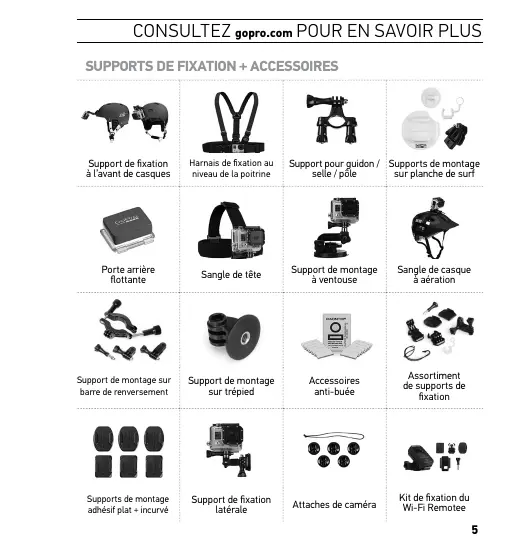Support de fixation à l’avant de casques Harnais de fixation au niveau de la poitrine Porte arrière flottante Sangle de tête Support de montage à ventouse Sangle de casque à aération Support de montage sur trépied Accessoires anti-buée Assortiment de supports de fixation Support de fixation latérale Attaches de caméra Kit de fixation du Wi-Fi Remotee Support de montage sur barre de renversement Supports de montage adhésif plat + incurvé Support pour guidon / Supports de montage selle / pôle sur planche de surf