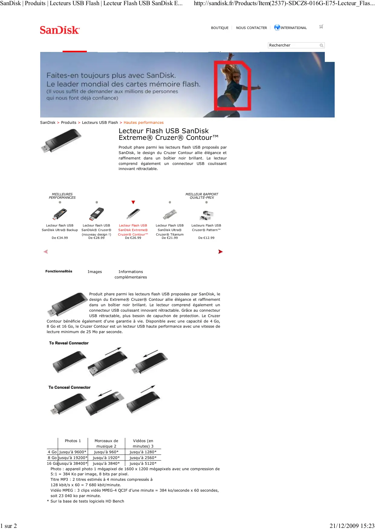 SanDisk | Produits | Lecteurs USB Flash | Lecteur Flash USB SanDisk E... 1 sur 2 http://sandisk.fr/Products/Item(2537)-SDCZ8-016G-E75-Lecteur_Flas... BOUTIQUE NOUS CONTACTER INTERNATIONAL Rechercher Entreprise Support Technique Téléchargements À propos de SanDisk SanDisk > Produits > Lecteurs USB Flash > Hautes performances Lecteur Flash USB SanDisk Extreme® Cruzer® Contour™ Produit phare parmi les lecteurs flash USB proposés par SanDisk, le design du Cruzer Contour allie élégance et raffinement dans un boîtier noir brillant. Le lecteur comprend également un connecteur USB coulissant innovant rétractable. MEILLEURES PERFORMANCES MEILLEUR RAPPORT QUALITÉ-PRIX Lecteur flash USB Lecteur flash USB Lecteur Flash USB Lecteur Flash USB Lecteurs Flash USB SanDisk Ultra® Backup SanDisk® Cruzer® (nouveau design !) De €28.99 SanDisk Extreme® Cruzer® Contour™ De €26.99 SanDisk Ultra® Cruzer® Titanium De €21.99 Cruzer® Pattern™ De €34.99 Fonctionnalités Images De €12.99 Informations complémentaires Produit phare parmi les lecteurs flash USB proposées par SanDisk, le design du Extreme® Cruzer® Contour allie élégance et raffinement dans un boîtier noir brillant. Le lecteur comprend également un connecteur USB coulissant innovant rétractable. Grâce au connecteur USB rétractable, plus besoin de capuchon de protection. Le Cruzer Contour bénéficie également d'une garantie à vie. Disponible avec une capacité de 4 Go, 8 Go et 16 Go, le Cruzer Contour est un lecteur USB haute performance avec une vitesse de lecture minimum de 25 Mo par seconde. Photos 1 Morceaux de musique 2 Vidéos (en minutes) 3 4 Go jusqu'à 9600* jusqu'à 960* jusqu'à 1280* 8 Go jusqu'à 19200* jusqu'à 1920* jusqu'à 2560* 16 Gojusqu'à 38400* jusqu'à 3840* jusqu'à 5120* Photo : appareil photo 1 mégapixel de 1600 x 1200 mégapixels avec une compression de 5:1 = 384 Ko par image, 8 bits par pixel. Titre MP3 : 2 titres estimés à 4 minutes compressés à 128 kbit/s x 60 = 7 680 kbit/minute. Vidéo MPEG : 3 clips vidéo MPEG-4 QCIF d’une minute = 384 ko/seconde x 60 secondes, soit 23 040 ko par minute.