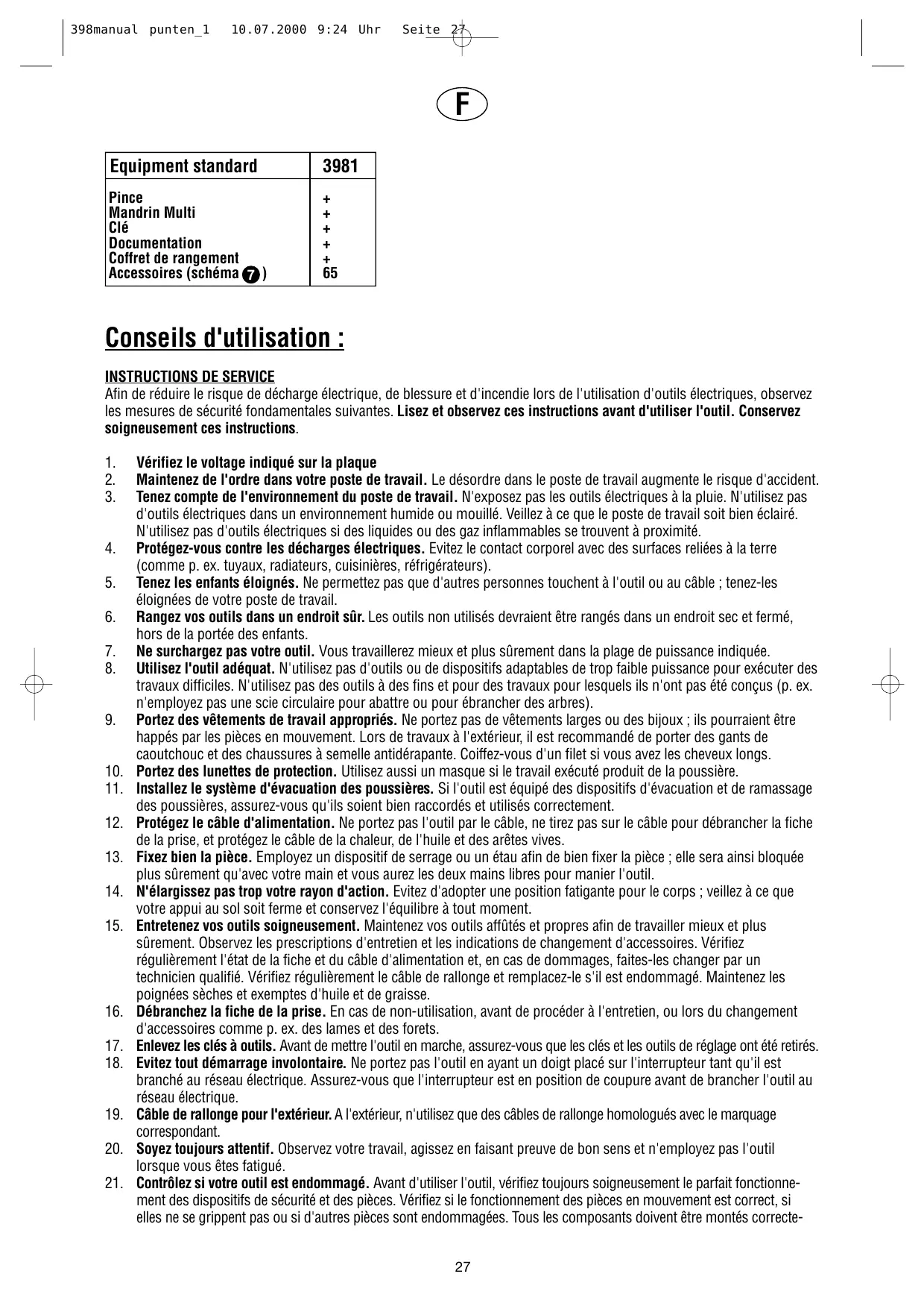 Vérifiez le voltage indiqué sur la plaque Maintenez de l'ordre dans votre poste de travail. Le désordre dans le poste de travail augmente le risque d'accident. Tenez compte de l'environnement du poste de travail. N'exposez pas les outils électriques à la pluie. N'utilisez pas d'outils électriques dans un environnement humide ou mouillé. Veillez à ce que le poste de travail soit bien éclairé. N'utilisez pas d'outils électriques si des liquides ou des gaz inflammables se trouvent à proximité. Protégez-vous contre les décharges électriques. Evitez le contact corporel avec des surfaces reliées à la terre (comme p. ex. tuyaux, radiateurs, cuisinières, réfrigérateurs). Tenez les enfants éloignés. Ne permettez pas que d'autres personnes touchent à l'outil ou au câble ; tenez-les éloignées de votre poste de travail. Rangez vos outils dans un endroit sûr. Les outils non utilisés devraient être rangés dans un endroit sec et fermé, hors de la portée des enfants. Ne surchargez pas votre outil. Vous travaillerez mieux et plus sûrement dans la plage de puissance indiquée. Utilisez l'outil adéquat. N'utilisez pas d'outils ou de dispositifs adaptables de trop faible puissance pour exécuter des travaux difficiles. N'utilisez pas des outils à des fins et pour des travaux pour lesquels ils n'ont pas été conçus (p. ex. n'employez pas une scie circulaire pour abattre ou pour ébrancher des arbres). Portez des vêtements de travail appropriés. Ne portez pas de vêtements larges ou des bijoux ; ils pourraient être happés par les pièces en mouvement. Lors de travaux à l'extérieur, il est recommandé de porter des gants de caoutchouc et des chaussures à semelle antidérapante. Coiffez-vous d'un filet si vous avez les cheveux longs. Portez des lunettes de protection. Utilisez aussi un masque si le travail exécuté produit de la poussière. Installez le système d'évacuation des poussières. Si l'outil est équipé des dispositifs d'évacuation et de ramassage des poussières, assurez-vous qu'ils soient bien raccordés et utilisés correctement. Protégez le câble d'alimentation. Ne portez pas l'outil par le câble, ne tirez pas sur le câble pour débrancher la fiche de la prise, et protégez le câble de la chaleur, de l'huile et des arêtes vives. Fixez bien la pièce. Employez un dispositif de serrage ou un étau afin de bien fixer la pièce ; elle sera ainsi bloquée plus sûrement qu'avec votre main et vous aurez les deux mains libres pour manier l'outil. N'élargissez pas trop votre rayon d'action. Evitez d'adopter une position fatigante pour le corps ; veillez à ce que votre appui au sol soit ferme et conservez l'équilibre à tout moment. Entretenez vos outils soigneusement. Maintenez vos outils affûtés et propres afin de travailler mieux et plus sûrement. Observez les prescriptions d'entretien et les indications de changement d'accessoires. Vérifiez régulièrement l'état de la fiche et du câble d'alimentation et, en cas de dommages, faites-les changer par un technicien qualifié. Vérifiez régulièrement le câble de rallonge et remplacez-le s'il est endommagé. Maintenez les poignées sèches et exemptes d'huile et de graisse. Débranchez la fiche de la prise. En cas de non-utilisation, avant de procéder à l'entretien, ou lors du changement d'accessoires comme p. ex. des lames et des forets. Enlevez les clés à outils. Avant de mettre l'outil en marche, assurez-vous que les clés et les outils de réglage ont été retirés. Evitez tout démarrage involontaire. Ne portez pas l'outil en ayant un doigt placé sur l'interrupteur tant qu'il est branché au réseau électrique. Assurez-vous que l'interrupteur est en position de coupure avant de brancher l'outil au réseau électrique. Câble de rallonge pour l'extérieur. A l'extérieur, n'utilisez que des câbles de rallonge homologués avec le marquage correspondant. Soyez toujours attentif. Observez votre travail, agissez en faisant preuve de bon sens et n'employez pas l'outil lorsque vous êtes fatigué. Contrôlez si votre outil est endommagé. Avant d'utiliser l'outil, vérifiez toujours soigneusement le parfait fonctionnement des dispositifs de sécurité et des pièces. Vérifiez si le fonctionnement des pièces en mouvement est correct, si elles ne se grippent pas ou si d'autres pièces sont endommagées. Tous les composants doivent être montés correcte27 398manual punten_1