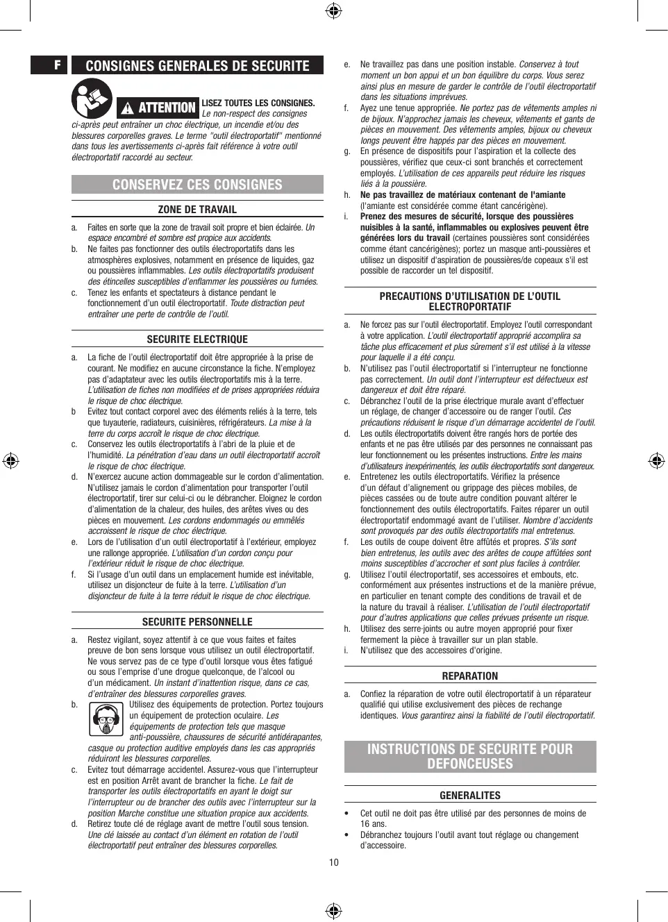 Le non-respect des consignes ci-après peut entraîner un choc électrique, un incendie et/ou des blessures corporelles graves. Le terme "outil électroportatif" mentionné dans tous les avertissements ci-après fait référence à votre outil électroportatif raccordé au secteur.