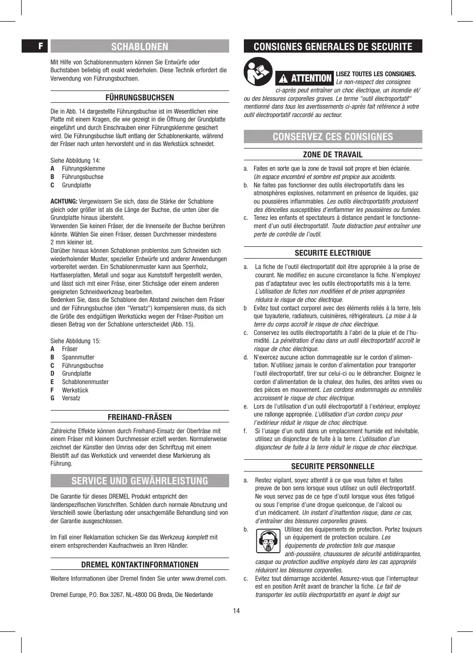 Ne jamais utilisez l’outil avec le câble ou la plaque-base (= dispositif de protection) endommagée; faites-les remplacer par un technicien qualifié. Evitez de laisser vos doigts près de la fraise quand l’outil est en marche. En cas de dysfonctionnement électrique ou mécanique, mettez directement l’outil hors service et débranchez la fiche. Au cas où la fraise est bloquée, ayant pour conséquence des saccades, mettez directement l’outil hors service. En cas d’interruption de courant ou de débranchement accidentel de la fiche, éteignez l’outil immédiatement pour l’empêcher de redémarrer de façon inopinée. Ne pas exercez une pression excessive sur l’outil, de sorte qu’il s’arrête.