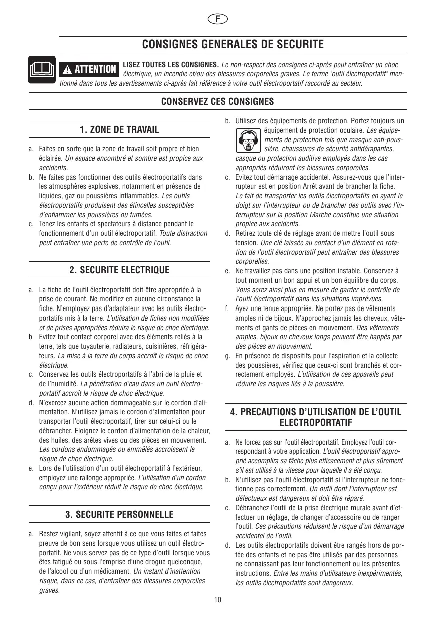 LISEZ TOUTES LES CONSIGNES. Le non-respect des consignes ci-après peut entraîner un choc électrique, un incendie et/ou des blessures corporelles graves. Le terme "outil électroportatif" mentionné dans tous les avertissements ci-après fait référence à votre outil électroportatif raccordé au secteur. ! ATTENTION