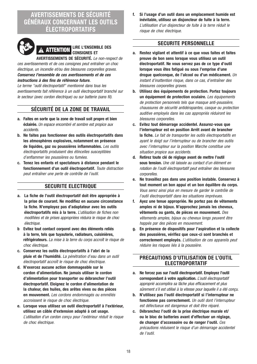 CONSIGNES ET AVERTISSEMENTS DE SÉCURITÉ. Le non-respect de ces avertissements et de ces consignes peut entraîner un choc électrique, un incendie et/ou des blessures corporelles graves. Conservez l'ensemble de ces avertissements et de ces instructions à des fins de référence future. Le terme "outil électroportatif" mentionné dans tous les avertissements fait référence à un outil électroportatif branché sur le secteur (avec cordon électrique) ou sur batterie (sans fil). ! ATTENTION a. Restez vigilant et attentif à ce que vous faites et faites preuve de bon sens lorsque vous utilisez un outil électroportatif. Ne vous servez pas de ce type d’outil lorsque vous êtes fatigué ou sous l’emprise d’une drogue quelconque, de l’alcool ou d’un médicament. Un instant d’inattention risque, dans ce cas, d’entraîner des blessures corporelles graves. b. Utilisez des équipements de protection. Portez toujours un équipement de protection oculaire. Les équipements de protection personnels tels que masque anti-poussière, chaussures de sécurité antidérapantes, casque ou protection auditive employés dans les cas appropriés réduiront les blessures corporelles. c. Evitez tout démarrage accidentel. Assurez-vous que l’interrupteur est en position Arrêt avant de brancher la fiche. Le fait de transporter les outils électroportatifs en ayant le doigt sur l’interrupteur ou de brancher des outils avec l’interrupteur sur la position Marche constitue une situation propice aux accidents. d. Retirez toute clé de réglage avant de mettre l’outil sous tension. Une clé laissée au contact d’un élément en rotation de l’outil électroportatif peut entraîner des blessures corporelles. e. Ne travaillez pas dans une position instable. Conservez à tout moment un bon appui et un bon équilibre du corps. Vous serez ainsi plus en mesure de garder le contrôle de l’outil électroportatif dans les situations imprévues. f. Ayez une tenue appropriée. Ne portez pas de vêtements amples ni de bijoux. N’approchez jamais les cheveux, vêtements ou gants, de pièces en mouvement. Des vêtements amples, bijoux ou cheveux longs peuvent être happés par des pièces en mouvement. g. En présence de dispositifs pour l’aspiration et la collecte des poussières, vérifiez que ceux-ci sont branchés et correctement employés. L’utilisation de ces appareils peut réduire les risques liés à la poussière. SÉCURITÉ DE LA ZONE DE TRAVAIL a. Faites en sorte que la zone de travail soit propre et bien éclairée. Un espace encombré et sombre est propice aux accidents. b. Ne faites pas fonctionner des outils électroportatifs dans les atmosphères explosives, notamment en présence de liquides, gaz ou poussières inflammables. Les outils électroportatifs produisent des étincelles susceptibles d’enflammer les poussières ou fumées. c. Tenez les enfants et spectateurs à distance pendant le fonctionnement d’un outil électroportatif. Toute distraction peut entraîner une perte de contrôle de l’outil. SECURITE ELECTRIQUE a. La fiche de l’outil électroportatif doit être appropriée à la prise de courant. Ne modifiez en aucune circonstance la fiche. N’employez pas d’adaptateur avec les outils électroportatifs mis à la terre. L’utilisation de fiches non modifiées et de prises appropriées réduira le risque de choc électrique. b Evitez tout contact corporel avec des éléments reliés à la terre, tels que tuyauterie, radiateurs, cuisinières, réfrigérateurs. La mise à la terre du corps accroît le risque de choc électrique. c. Conservez les outils électroportatifs à l’abri de la pluie et de l’humidité. La pénétration d’eau dans un outil électroportatif accroît le risque de choc électrique. d. N’exercez aucune action dommageable sur le cordon d’alimentation. Ne jamais utiliser le cordon d’alimentation pour transporter ou débrancher l’outil électroportatif. Eloignez le cordon d’alimentation de la chaleur, des huiles, des arêtes vives ou des pièces en mouvement. Les cordons endommagés ou emmêlés accroissent le risque de choc électrique. e. Lorsque vous utilisez un outil électroportatif à l'extérieur, utilisez un câble d'extension adapté à cet usage. L’utilisation d’un cordon conçu pour l’extérieur réduit le risque de choc électrique.