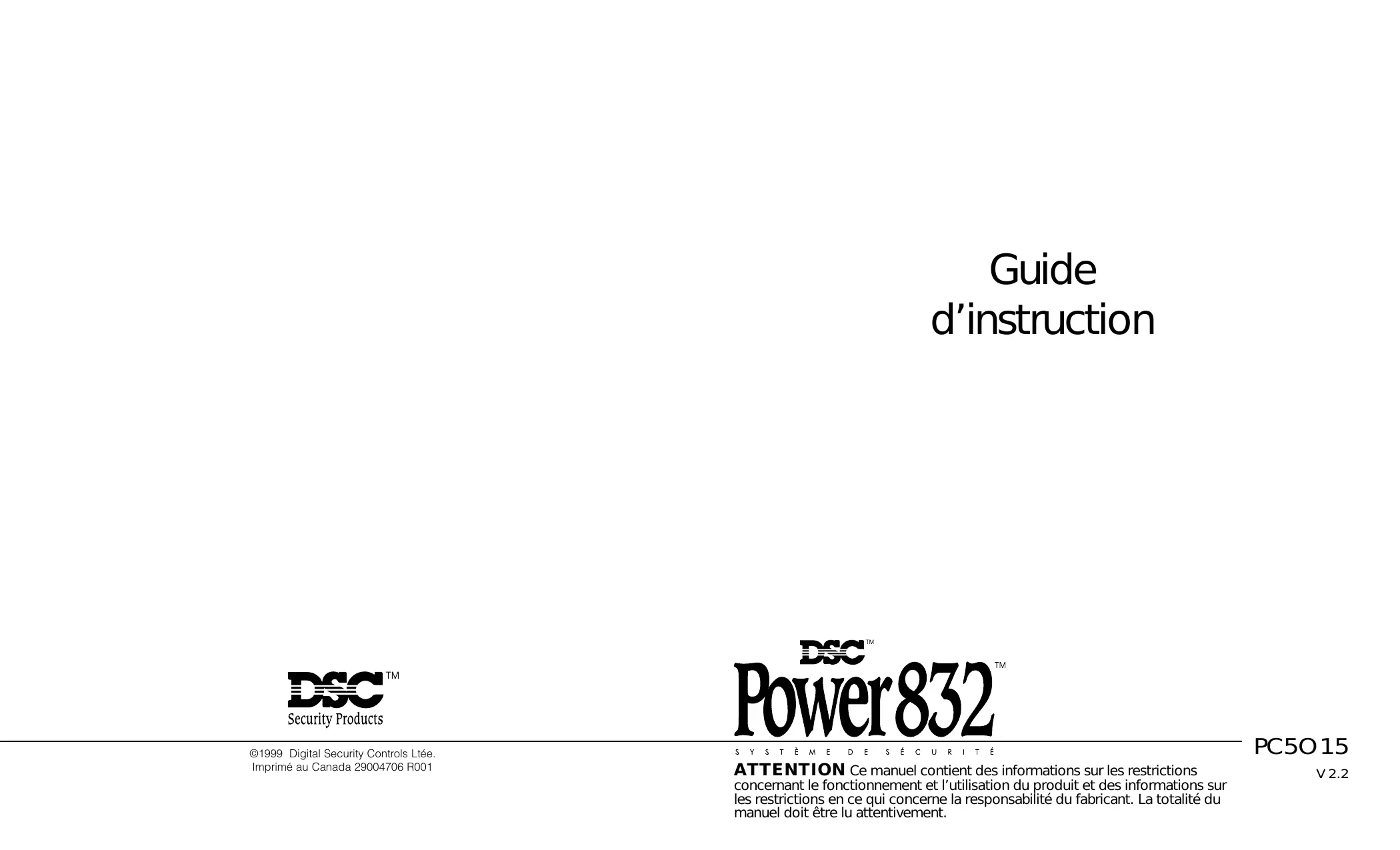 Guide d’instruction ©1999 Digital Security Controls Ltée. Imprimé au Canada 29004706 R001 PC5O15 ATTENTION Ce manuel contient des informations sur les restrictions concernant le fonctionnement et l’utilisation du produit et des informations sur les restrictions en ce qui concerne la responsabilité du fabricant. La totalité du manuel doit être lu attentivement. V 2.2
