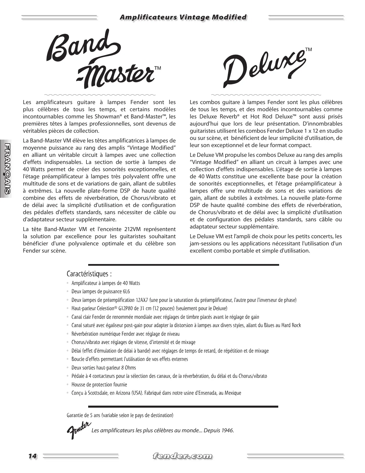 Deux lampes de puissance 6L6 Deux lampes de préamplification 12AX7 (une pour la saturation du préamplificateur, l'autre pour l'inverseur de phase) Haut-parleur Celestion® G12P80 de 31 cm (12 pouces) (seulement pour le Deluxe) Canal clair Fender de renommée mondiale avec réglages de timbre placés avant le réglage de gain Canal saturé avec égaliseur post-gain pour adapter la distorsion à lampes aux divers styles, allant du Blues au Hard Rock Réverbération numérique Fender avec réglage de niveau Chorus/vibrato avec réglages de vitesse, d'intensité et de mixage Délai (effet d'émulation de délai à bande) avec réglages de temps de retard, de répétition et de mixage Boucle d'effets permettant l'utilisation de vos effets externes Deux sorties haut-parleur 8 Ohms Pédale à 4 contacteurs pour la sélection des canaux, de la réverbération, du délai et du Chorus/vibrato Housse de protection fournie Conçu à Scottsdale, en Arizona (USA). Fabriqué dans notre usine d'Ensenada, au Mexique