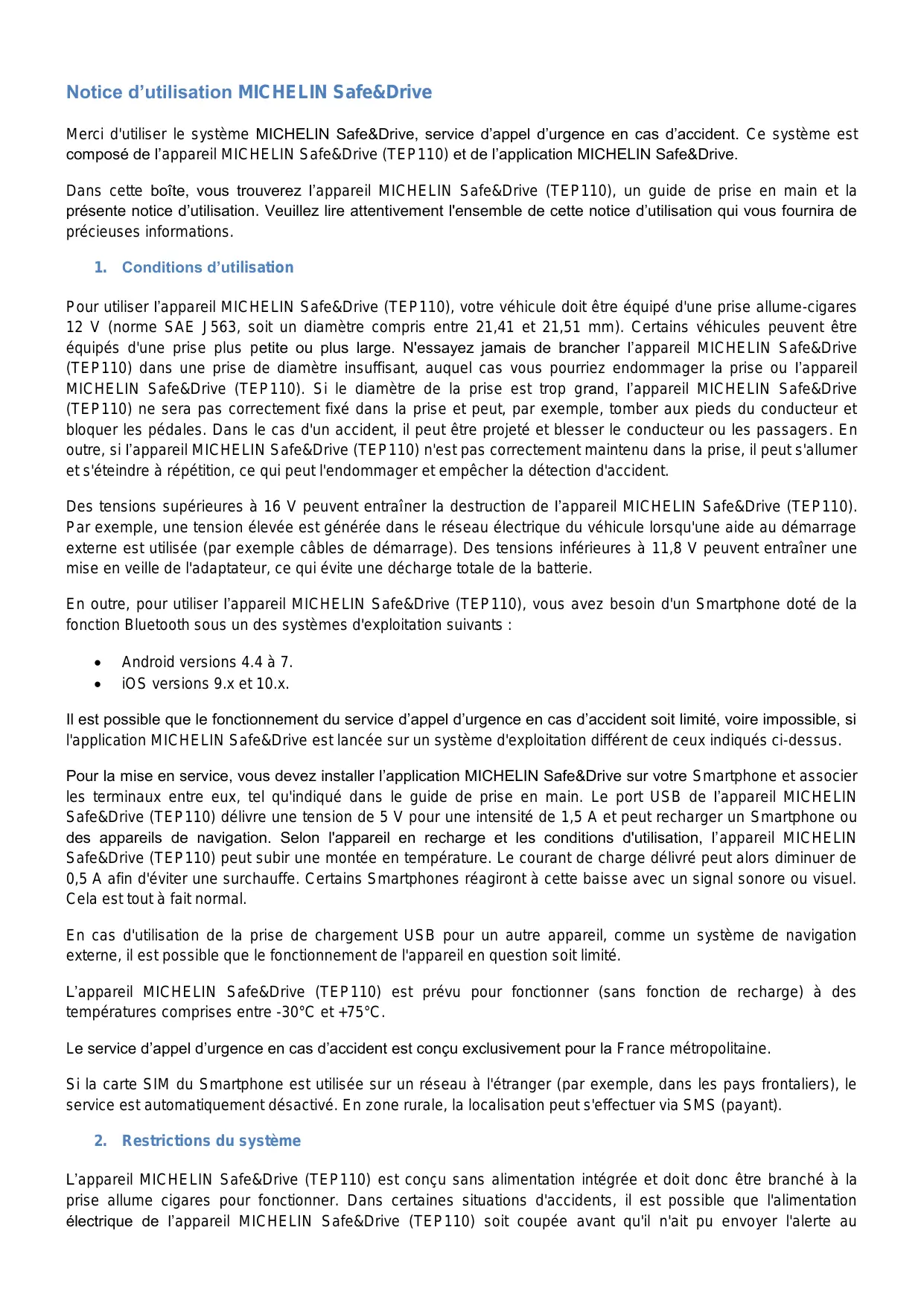 Cela est tout à fait normal. En cas d'utilisation de la prise de chargement USB pour un autre appareil, comme un système de navigation externe, il est possible que le fonctionnement de l'appareil en question soit limité. L’appareil MICHELIN Safe&Drive (TEP110) est prévu pour fonctionner (sans fonction de recharge) à des températures comprises entre -30°C et +75°C. Le service d’appel d’urgence en cas d’accident est conçu exclusivement pour la France métropolitaine. Si la carte SIM du Smartphone est utilisée sur un réseau à l'étranger (par exemple, dans les pays frontaliers), le service est automatiquement désactivé. En zone rurale, la localisation peut s'effectuer via SMS (payant). 2. Restrictions du système L’appareil MICHELIN Safe&Drive (TEP110) est conçu sans alimentation intégrée et doit donc être branché à la prise allume cigares pour fonctionner. Dans certaines situations d'accidents, il est possible que l'alimentation électrique de l’appareil MICHELIN Safe&Drive (TEP110) soit coupée avant qu'il n'ait pu envoyer l'alerte au