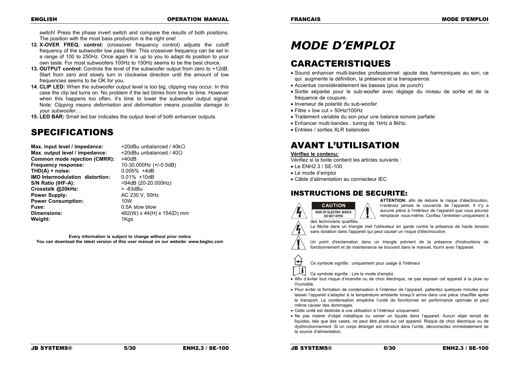 Vérifiez le contenu: Vérifiez si la boite contient les articles suivants : Le ENH2.3 / SE-100 Le mode d’emploi Câble d’alimentation au connecteur IEC INSTRUCTIONS DE SECURITE: CAUTION ATTENTION: afin de réduire le risque d’électrocution, n’enlevez jamais le couvercle de l’appareil. Il n’y a aucune pièce à l’intérieur de l’appareil que vous pouvez remplacer vous-même. Confiez l’entretien uniquement à des techniciens qualifiés. La flèche dans un triangle met l'utilisateur en garde contre la présence de haute tension sans isolation dans l'appareil qui peut causer un risque d'électrocution. Un point d'exclamation dans un triangle prévient de la présence d'instructions de fonctionnement et de maintenance se trouvant dans le manuel, fourni avec l'appareil. Ce symbole signifie : uniquement pour usage à l'intérieur Ce symbole signifie : Lire le mode d’emploi. Afin d’éviter tout risque d’incendie ou de choc électrique, ne pas exposer cet appareil à la pluie ou l’humidité. Pour éviter la formation de condensation à l’intérieur de l’appareil, patientez quelques minutes pour laisser l’appareil s’adapter à la température ambiante lorsqu’il arrive dans une pièce chauffée après le transport. La condensation empêche l’unité de fonctionner en performance optimale et peut même causer des dommages. Cette unité est destinée à une utilisation à l’intérieur uniquement. Ne pas insérer d’objet métallique ou verser un liquide dans l’appareil. Aucun objet rempli de liquides, tels que des vases, ne peut être placé sur cet appareil. Risque de choc électrique ou de dysfonctionnement. Si un corps étranger est introduit dans l’unité, déconnectez immédiatement de la source d’alimentation. JB SYSTEMS® 5/30 ENH2.3 / SE-100 JB SYSTEMS® 6/30 ENH2.3 / SE-100 FRANCAIS