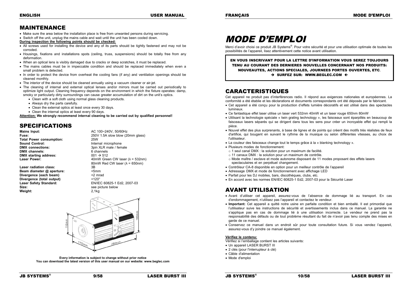 MODE D'EMPLOI LASER BURST III JBSYSTEMS