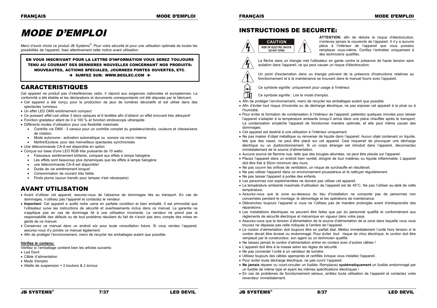 CARACTERISTIQUES CAUTION ATTENTION: afin de réduire le risque d’électrocution, n’enlevez jamais le couvercle de l’appareil. Il n’y a aucune pièce à l’intérieur de l’appareil que vous puissiez remplacer vous-même. Confiez l’entretien uniquement à des techniciens qualifiés. La flèche dans un triangle met l'utilisateur en garde contre la présence de haute tension sans isolation dans l'appareil, ce qui peut causer un risque d'électrocution. Un point d'exclamation dans un triangle prévient de la présence d'instructions relatives au fonctionnement et à la maintenance se trouvant dans le manuel fourni avec l'appareil. Ce symbole signifie: uniquement pour usage à l'intérieur. Cet appareil ne produit pas d’interférences radio. Il répond aux exigences nationales et européennes. La conformité a été établie et les déclarations et documents correspondants ont été déposés par le fabricant. Cet appareil a été conçu pour la production de jeux de lumières décoratifs et est utilisé dans des spectacles lumineux. Un effet LED DMX extrêmement compact Ce puissant effet Led utilise 3 discs optiques et 6 lentilles afin d’obtenir un effet innovant très attrayant! Fonction gradateur allant de 0 à 100 % et fonction stroboscope ultrarapide Différents modes d’utilisation pour une flexibilité maximale: Contrôle via DMX : 3 canaux pour un contrôle complet du gradateur/strobo, couleurs et vitesse/sens de rotation. Mode autonome : activation automatique ou sonore via micro interne Maître/Esclave: pour des merveilleux spectacles synchronisés Une télécommande CA-8 est disponible en option Conçue sur base d'une LED RGB très puissante de 10 watts: Faisceaux extrêmement brillants, comparé aux effets à lampe halogène Les effets sont beaucoup plus dynamiques que les effets à lampe halogène une télécommande CA-8 est disponible! Durée de vie extrêmement longue! Consommation de courant très faible Poids plume (aucun transfo pour lampes n'est nécessaire) AVANT UTILISATION Avant d’utiliser cet appareil, assurez-vous de l’absence de dommages liés au transport. En cas de dommages, n’utilisez pas l’appareil et contactez le vendeur. Important: Cet appareil a quitté notre usine en parfaite condition et bien emballé. Il est primordial que l’utilisateur suive les instructions de sécurité et avertissements inclus dans ce manuel. La garantie ne s’applique pas en cas de dommage lié à une utilisation incorrecte. Le vendeur ne prend pas la responsabilité des défauts ou de tout problème résultant du fait de n’avoir pas tenu compte des mises en garde de ce manuel. Conservez ce manuel dans un endroit sûr pour toute consultation future. Si vous vendez l’appareil, assurez-vous d’y joindre ce manuel également. Afin de protéger l’environnement, merci de recycler les emballages autant que possible. Vérifiez le contenu: Vérifiez si l’emballage contient bien les articles suivants: Led Devil Câble d’alimentation Mode d'emploi Attelle de suspension + 2 boulons & 2 écrous JB SYSTEMS® FRANÇAIS 7/37 LED DEVIL Ce symbole signifie : Lire le mode d’emploi. Afin de protéger l’environnement, merci de recycler les emballages autant que possible. Afin d’éviter tout risque d’incendie ou de décharge électrique, ne pas exposer cet appareil à la pluie ou à l’humidité. Pour éviter la formation de condensation à l’intérieur de l’appareil, patientez quelques minutes pour laisser l’appareil s’adapter à la température ambiante lorsqu’il arrive dans une pièce chauffée après le transport. La condensation empêche l'appareil de fonctionner manière optimale, et elle peut même causer des dommages. Cet appareil est destiné à une utilisation à l’intérieur uniquement. Ne pas insérer d’objet métallique ou renverser de liquide dans l’appareil. Aucun objet contenant un liquide, tels que des vases, ne peut être placé sur cet appareil. Cela risquerait de provoquer une décharge électrique ou un dysfonctionnement. Si un corps étranger est introduit dans l’appareil, déconnectez immédiatement de la source d’alimentation. Aucune source de flamme nue, telle que des bougies allumées, ne peut être placée sur l'appareil. Placez l’appareil dans un endroit bien ventilé, éloigné de tout matériau ou liquide inflammable. L’appareil doit être fixé à 50cm minimum des murs. Ne pas couvrir les orifices de ventilation, un risque de surchauffe en résulterait. Ne pas utiliser l'appareil dans un environnement poussiéreux et le nettoyer régulièrement. Ne pas laisser l'appareil à portée des enfants. Les personnes non expérimentées ne doivent pas utiliser cet appareil. La température ambiante maximale d’utilisation de l’appareil est de 45°C. Ne pas l’utiliser au-delà de cette température. Assurez-vous que la zone au-dessous du lieu d’installation ne comporte pas de personnes non concernées pendant le montage, le démontage et les opérations de maintenance. Débranchez toujours l’appareil si vous ne l’utilisez pas de manière prolongée avant d’entreprendre des réparations. Les installations électriques ne peuvent être faites que par du personnel qualifié et conformément aux règlements de sécurité électrique et mécanique en vigueur dans votre pays. Assurez-vous que la tension d’alimentation de la source d’alimentation de la zone dans laquelle vous vous trouvez ne dépasse pas celle indiquée à l’arrière de l’appareil. Le cordon d’alimentation doit toujours être en parfait état. Mettez immédiatement l’unité hors tension si le cordon devait être écrasé ou endommagé. Pour éviter tout risque de choc électrique, le cordon doit être remplacé par le constructeur, son agent ou un technicien qualifié. Ne laissez jamais le cordon d’alimentation entrer en contact avec d’autres câbles ! L’appareil doit être à la masse selon les règles de sécurité. Ne pas 