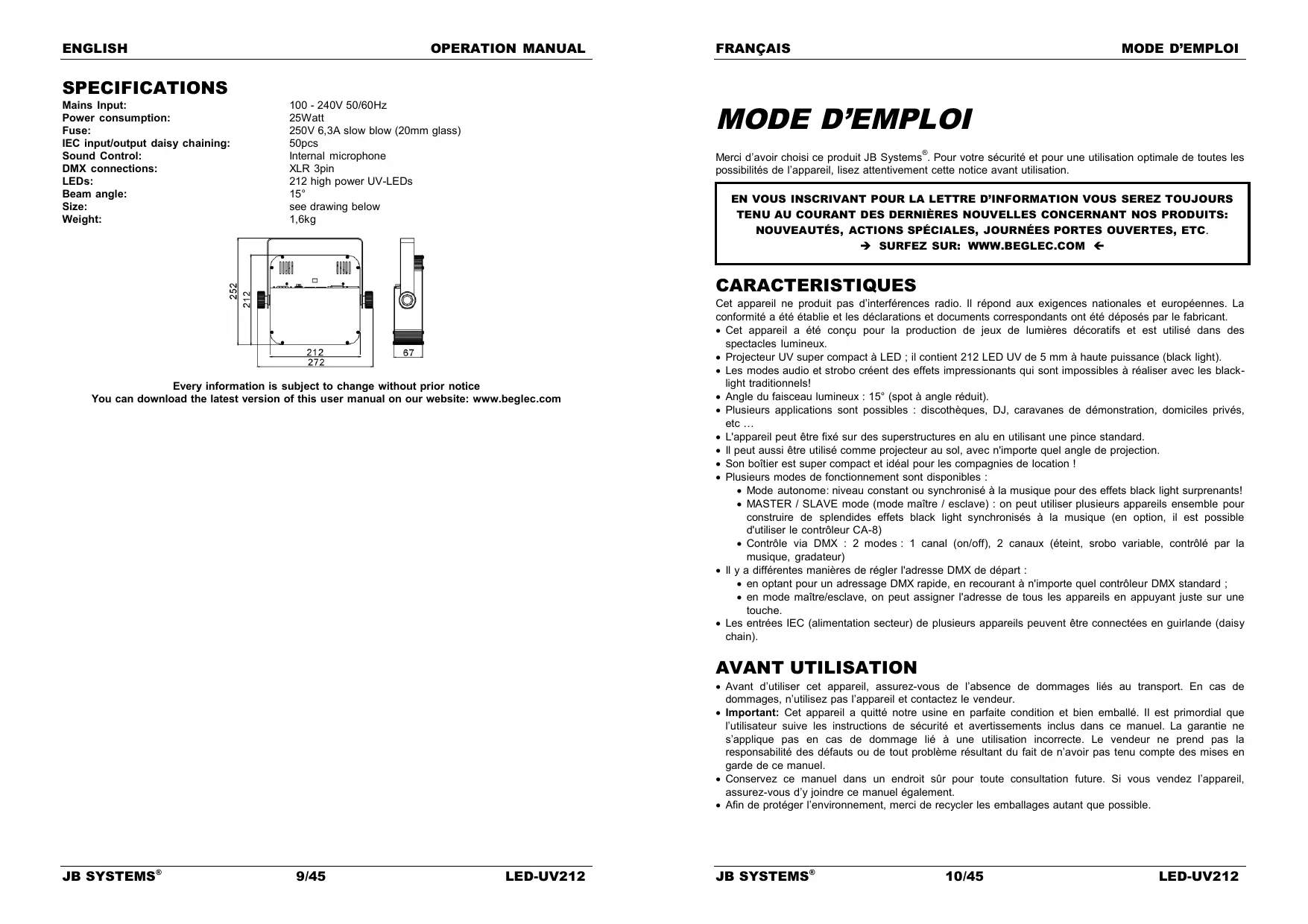 MODE D'EMPLOI LED-UV212 JBSYSTEMS