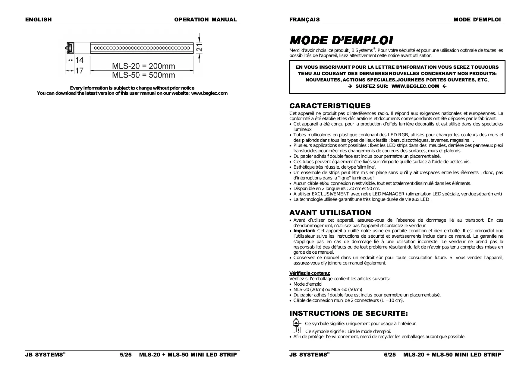 Débarrassez-vous de l’appareil et des piles usagées de manière écologique Conformément aux dispositions légales de votre pays. Merci d’avoir choisi ce produit JB Systems . Pour votre sécurité et pour une utilisation optimale de toutes les possibilités de l’appareil, lisez attentivement cette notice avant utilisation. CARACTERISTIQUES Cet appareil ne produit pas d’interférences radio. Il répond aux exigences nationales et européennes. La conformité a été établie et les déclarations et documents correspondants ont été déposés par le fabricant. Cet appareil a été conçu pour la production d’effets lumière décoratifs et est utilisé dans des spectacles lumineux. Tubes multicolores en plastique contenant des LED RGB, utilisés pour changer les couleurs des murs et des plafonds dans tous les types de lieux festifs : bars, discothèques, tavernes, magasins, … Plusieurs applications sont possibles : fixez les LED strips dans des meubles, derrière des panneaux plexi translucides pour créer des changements de couleurs des surfaces, murs et plafonds. Du papier adhésif double face est inclus pour permettre un placement aisé. Ces tubes peuvent également être fixés sur n'importe quelle surface à l'aide de petites vis. Esthétique très réussie, de type 'slim line'. Un ensemble de strips peut être mis en place sans qu'il y ait d'espaces entre les éléments : donc, pas d'interruptions dans la "ligne" lumineuse ! Aucun câble et/ou connexion n'est visible, tout est totalement dissimulé dans les éléments. Disponible en 2 longueurs : 20 cm et 50 cm. A utiliser EXCLUSIVEMENT avec notre LED MANAGER (alimentation LED spéciale, vendue séparément) La technologie utilisée garantit une très longue durée de vie aux LED ! AVANT UTILISATION Avant d’utiliser cet appareil, assurez-vous de l’absence de dommage lié au transport. En cas d’endommagement, n’utilisez pas l’appareil et contactez le vendeur. Important: Cet appareil a quitté notre usine en parfaite condition et bien emballé. Il est primordial que l’utilisateur suive les instructions de sécurité et avertissements inclus dans ce manuel. La garantie ne s’applique pas en cas de dommage lié à une utilisation incorrecte. Le vendeur ne prend pas la responsabilité des défauts ou de tout problème résultant du fait de n’avoir pas tenu compte des mises en garde de ce manuel. Conservez ce manuel dans un endroit sûr pour toute consultation future. Si vous vendez l’appareil, assurez-vous d’y joindre ce manuel également. Vérifiez le contenu: Vérifiez si l’emballage contient les articles suivants: Mode d'emploi MLS-20 (20cm) ou MLS-50 (50cm) Du papier adhésif double face est inclus pour permettre un placement aisé. Câble de connexion muni de 2 connecteurs (L = 10 cm). INSTRUCTIONS DE SECURITE: Ce symbole signifie: uniquement pour usage à l'intérieur. Ce symbole signifie : Lire le mode d’emploi. Afin de protéger l’environnement, merci de recycler les emballages autant que possible. JB SYSTEMS® 5/25 Ne pas exposer cet appareil à la pluie ou l’humidité. Pour éviter la formation de condensation à l’intérieur de l’appareil, patientez quelques minutes pour laisser l’appareil s’adapter à la température ambiante lorsqu’il arrive dans une pièce chauffée après le transport. La condensation empêche l’unité de fonctionner en performance optimale et peut même causer des dommages. Cette unité est destinée à une utilisation à l’intérieur uniquement. Ne placez pas d’objets en métal ou ne renversez pas de liquide à l’intérieur de l’appareil. Si un corps étranger entre dans l’appareil, débranchez immédiatement la configuration de l’alimentation secteur. Ne pas utiliser dans un environnement poussiéreux et nettoyez l’unité régulièrement. Ne pas laisser l’unité à portée des enfants. Les personnes non expérimentées ne doivent pas utiliser cet appareil. La température ambiante maximum d’utilisation de l’appareil est de 40°C. Ne pas l’utiliser au-delà de cette température. Assurez-vous que la zone au-dessous du lieu d’installation ne comporte pas de personnes indésirables pendant le montage, le démontage et les opérations de maintenance. Les installations électriques ne peuvent être faites que par du personnel qualifié et conformément aux régulations de sécurité électrique et mécanique en vigueur dans votre pays. Les câbles doivent toujours être en parfaite condition: allumez le LED MANAGER immédiatement si les câbles sont écrasés ou endommagés. Cet appareil doit être utilisé avec le LED MANAGER : ne branchez pas l’appareil sur un variateur (dimmer) normal ou sur une autre alimentation secteur. En cas de problèmes de fonctionnement sérieux, arrêtez toute utilisation de l’appareil et contactez votre revendeur immédiatement. Le boîtier doit être remplacé s’il est visiblement endommagé. Utilisez l’emballage d’origine si l’appareil doit être transporté. Pour des raisons de sécurité, il est interdit d’apporter toute modification à l’unité non spécifiquement autorisée par les parties responsables. Important: Ne pas utiliser d’effets en présence de personnes souffrant d’épilepsie. DESCRIPTION: