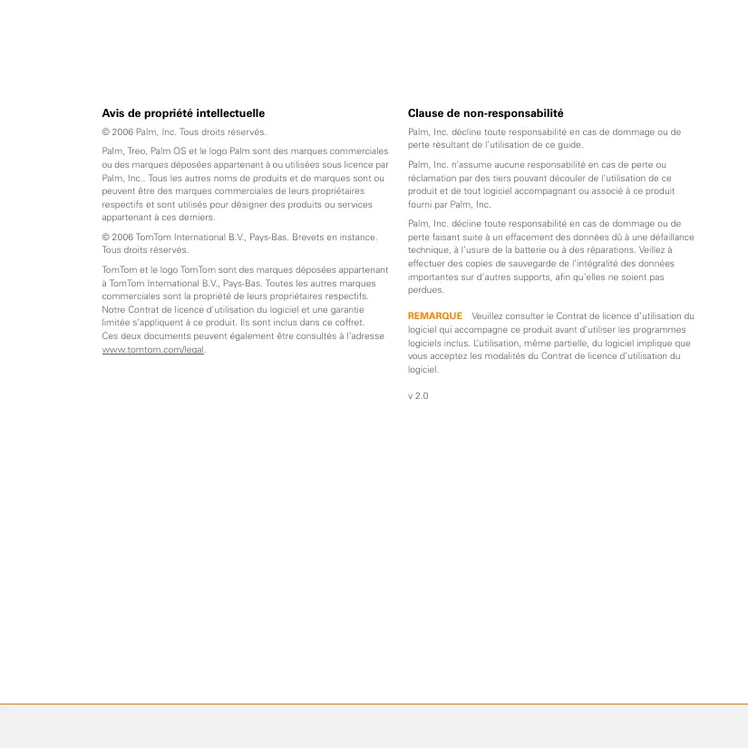 Dois-je maintenir mon produit et le récepteur connectés à l’adaptateur de voiture pendant leur utilisation ? Si votre produit est entièrement chargé, il peut fonctionner pendant 4 à 5 heures dans votre voiture. Pour les trajets plus longs, il est conseillé de maintenir l’adaptateur de voiture connecté afin que votre produit et le récepteur ne se déchargent pas. Vous évitez ainsi que la charge de chaque batterie ne devienne trop faible pour assurer le fonctionnement de la connexion Bluetooth. Où puis-je obtenir de l’assistance si j’en ai besoin ? Allez sur le site Web Palm à l’adresse www.palm.com/support. Informations importantes relatives à la sécurité et informations légales Conduisez prudemment en suivant les informations des panneaux de signalisation, en plus du navigateur GPS. Ne vous laissez pas distraire par le navigateur GPS pendant que vous conduisez. Utilisez les invites vocales afin de minimiser la nécessité de regarder l’affichage. N’entrez pas de destination ou n’accédez pas à d’autres fonctions demandant du temps si le véhicule n’est pas à l’arrêt. Réglez les paramètres avant de vous mettre en route ou, si vous avez besoin d’effectuer des modifications, garez-vous en toute sécurité et en respectant le Code de la route. AVERTISSEMENT Veuillez lire les informations suivantes pour garantir une utilisation sécurisée du navigateur GPS. Système mondial de localisation (Global Positioning System ou GPS) Le système mondial de localisation (Global Positioning System ou GPS) est un système satellite qui fournit des informations de localisation et d’heure dans le monde entier. GPS est exploité et contrôlé par le gouvernement des Etats-Unis d’Amérique, qui est responsable de sa disponibilité et de sa précision. Tout changement relatif à la disponibilité et à la précision de GPS peut avoir un impact sur le fonctionnement de votre récepteur GPS. Les conditions climatiques affectent le fonctionnement de votre récepteur GPS. TomTom B.V. et Palm ne peuvent accepter aucune responsabilité quant à la disponibilité et à la précision de GPS. A utiliser avec précaution Utilisez le navigateur GPS uniquement comme une aide à la navigation. Il n’est pas conçu pour une utilisation nécessitant des mesures précises. Le système mondial de localisation (Global Positioning System ou GPS) est exploité par le gouvernement des Etats-Unis d’Amérique et est sujet à des modifications qui peuvent affecter la précision et les performances de cet équipement GPS.