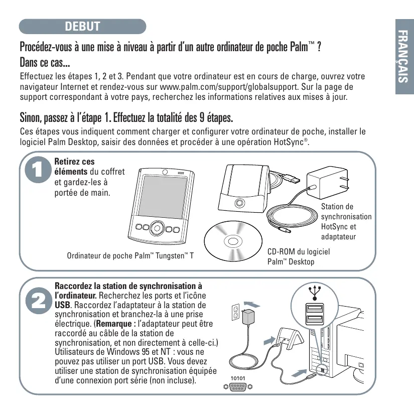 DEBUT Procédez-vous à une mise à niveau à partir d'un autre ordinateur de poche Palm” ? Dans ce cas... Effectuez les étapes 1, 2 et 3. Pendant que votre ordinateur est en cours de charge, ouvrez votre navigateur Internet et rendez-vous sur www.palm.com/support/globalsupport. Sur la page de Support correspondant à votre pays, recherchez les informations relatives aux mises à jour. Sinon, passez à l'étape 1. Effectuez la totalité des 9 étapes. Ces étapes vous indiquent comment charger et configurer votre ordinateur de poche, installer le logiciel Palm Desktop, saisir des données et procéder à une opération HotSync®. portée de main. HotSync et adaptateur CD-ROM du logiciel Palm” Desktop L Ordinateur de poche Palm” Tungsten” T l'ordinateur. Recherchez les ports et l'icône USB. Raccordez l'adaptateur à la station de synchronisation et branchez-la à une prise électrique. (Remarque : l'adaptateur peut être raccordé au câble de la station de synchronisation, et non directement à celle-ci.) Utilisateurs de Windows 95 et NT : vous ne pouvez pas utiliser un port USB. Vous devez utiliser une station de synchronisation équipée N d'une connexion port série (non incluse). [ 2 Raccordez la station de synchronisation à Retirez ces D éments du coffret = et gardez-les à ETAT