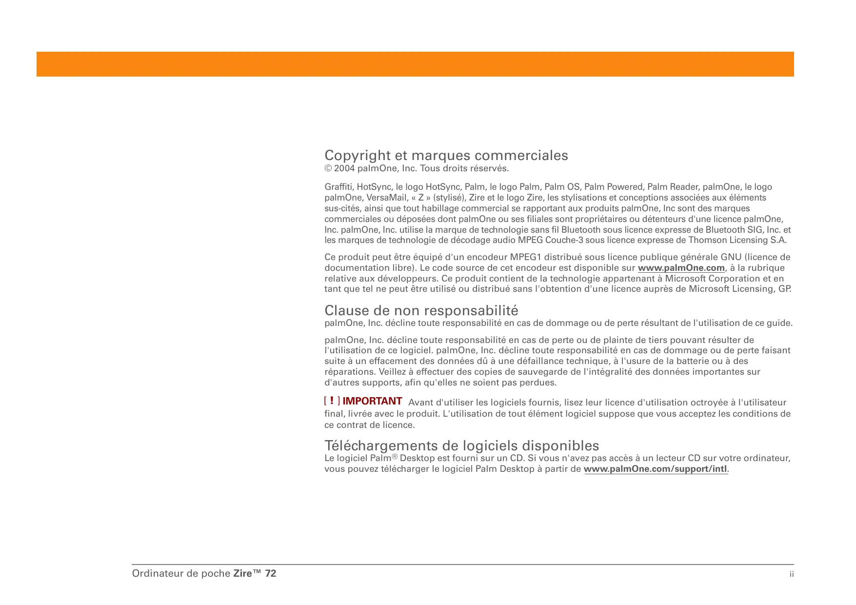 Copyright et marques commerciales © 2004 palmOne, Inc. Tous droits réservés. Graffiti, HotSync, le logo HotSync, Palm, le logo Palm, Palm OS, Palm Powered, Palm Reader, palmOne, le logo palmOne, VersaMail, « Z » (stylisé), Zire et le logo Zire, les stylisations et conceptions associées aux éléments sus-cités, ainsi que tout habillage commercial se rapportant aux produits palmOne, Inc sont des marques commerciales ou déposées dont palmOne ou ses filiales sont propriétaires ou détenteurs d'une licence palmOne, Inc. palmOne, Inc. utilise la marque de technologie sans fil Bluetooth sous licence expresse de Bluetooth SIG, Inc. et les marques de technologie de décodage audio MPEG Couche-3 sous licence expresse de Thomson Licensing S.A. Ce produit peut être équipé d'un encodeur MPEG1 distribué sous licence publique générale GNU (licence de documentation libre). Le code source de cet encodeur est disponible sur www.palmOne.com, à la rubrique relative aux développeurs. Ce produit contient de la technologie appartenant à Microsoft Corporation et en tant que tel ne peut être utilisé ou distribué sans l'obtention d'une licence auprès de Microsoft Licensing, GP. Clause de non responsabilité palmOne, Inc. décline toute responsabilité en cas de dommage ou de perte résultant de l'utilisation de ce guide. palmOne, Inc. décline toute responsabilité en cas de perte ou de plainte de tiers pouvant résulter de l'utilisation de ce logiciel. palmOne, Inc. décline toute responsabilité en cas de dommage ou de perte faisant suite à un effacement des données dû à une défaillance technique, à l'usure de la batterie ou à des réparations. Veillez à effectuer des copies de sauvegarde de l'intégralité des données importantes sur d'autres supports, afin qu'elles ne soient pas perdues. LTJIMPORTANT Avant d'utiliser les logiciels fournis, lisez leur licence d'utilisation octroyée à l'utilisateur final, livrée avec le produit. L'utilisation de tout élément logiciel suppose que vous acceptez les conditions de ce contrat de licence. Téléchargements de logiciels disponibles Le logiciel Palm® Desktop est fourni sur un CD. Si vous n'avez pas accès à un lecteur CD sur votre ordinateur, vous pouvez télécharger le logiciel Palm Desktop à partir de www.palmOne.com/support/intl. Ordinateur de poche Zire"" 72 ü