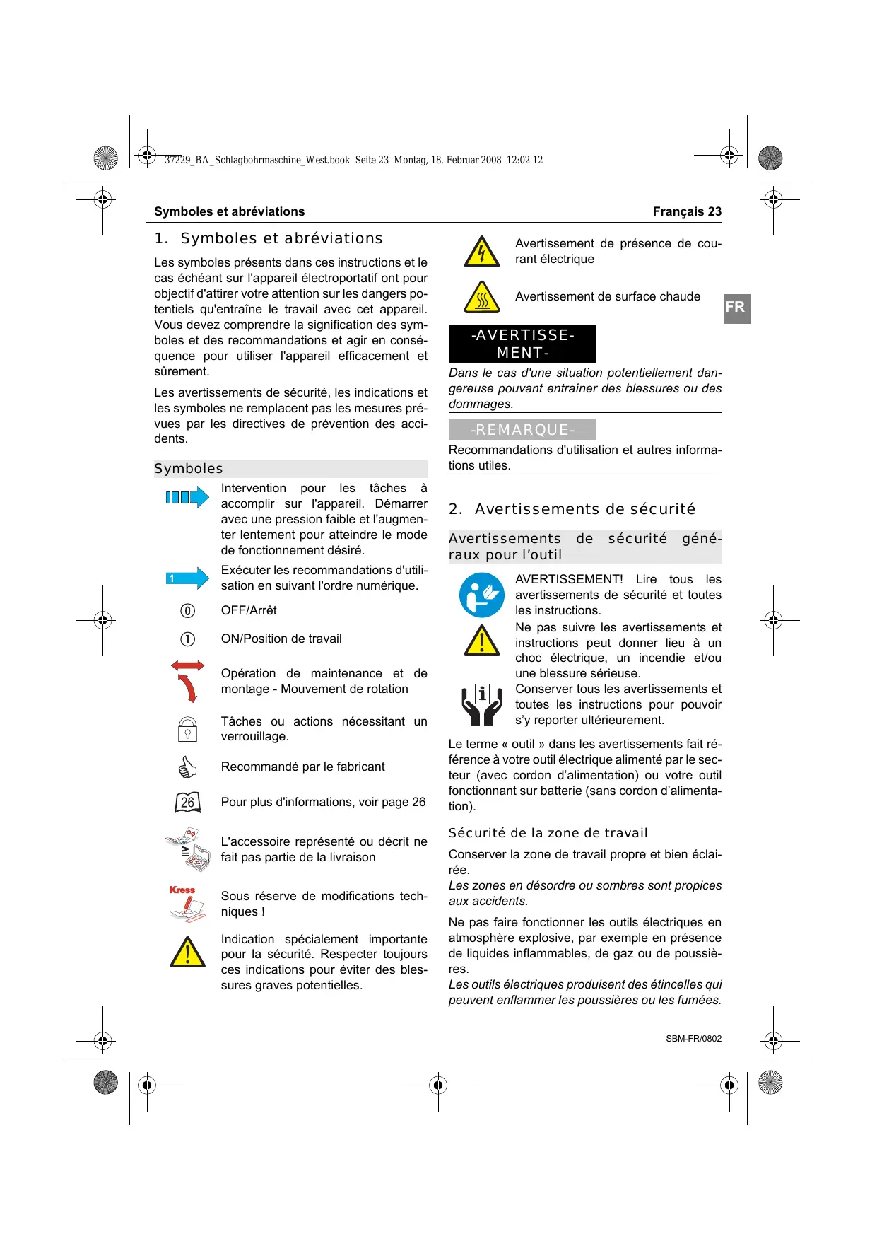 37229_BA_Schlagbohrmaschine_West.book Seite 23 Montag, 18. Februar 2008 12:02 12 Mode d’emploi original "Perceuse à percussion" Symboles et abréviations