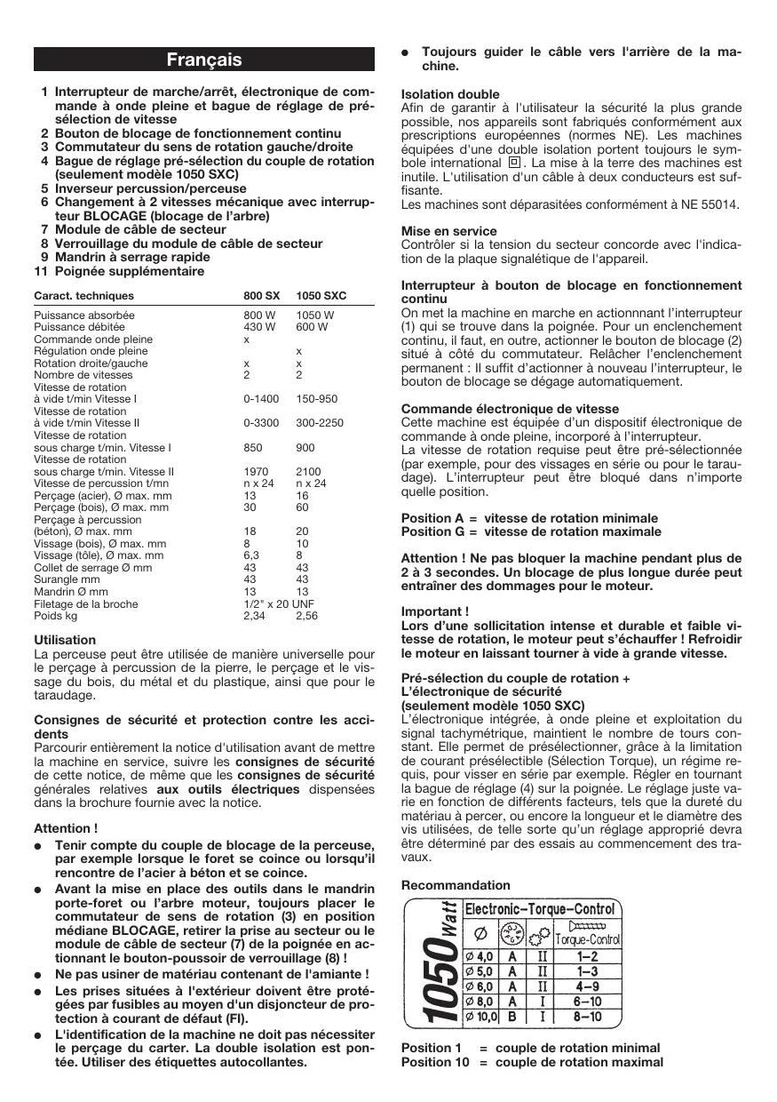 Français 1 Interrupteur de marche/arrêt, électronique de commande à onde pleine et bague de réglage de présélection de vitesse 2 Bouton de blocage de fonctionnement continu 13 Commutateur du sens de rotation gauche/droite 14 Bague de réglage pré-sélection du couple de rotation (seulement modèle 1050 SXC) 5 Inverseur percussion/perceuse 6 Changement à 2 vitesses mécanique avec interrupteur BLOCAGE (blocage de l’arbre) 7 Module de câble de secteur 8 Verrouillage du module de câble de secteur 9 Mandrin à serrage rapide 11 Poignée supplémentaire Caract. techniques 800 SX 1050 SXC Puissance absorbée Puissance débitée Commande onde pleine Régulation onde pleine Rotation droite/gauche Nombre de vitesses Vitesse de rotation à vide t/min Vitesse I Vitesse de rotation à vide t/min Vitesse II Vitesse de rotation sous charge t/min. Vitesse I Vitesse de rotation sous charge t/min. Vitesse II Vitesse de percussion t/mn Perçage (acier), Ø max. mm Perçage (bois), Ø max. mm Perçage à percussion (béton), Ø max. mm Vissage (bois), Ø max. mm Vissage (tôle), Ø max. mm Collet de serrage Ø mm Surangle mm Mandrin Ø mm Filetage de la broche Poids kg 800 W 430 W