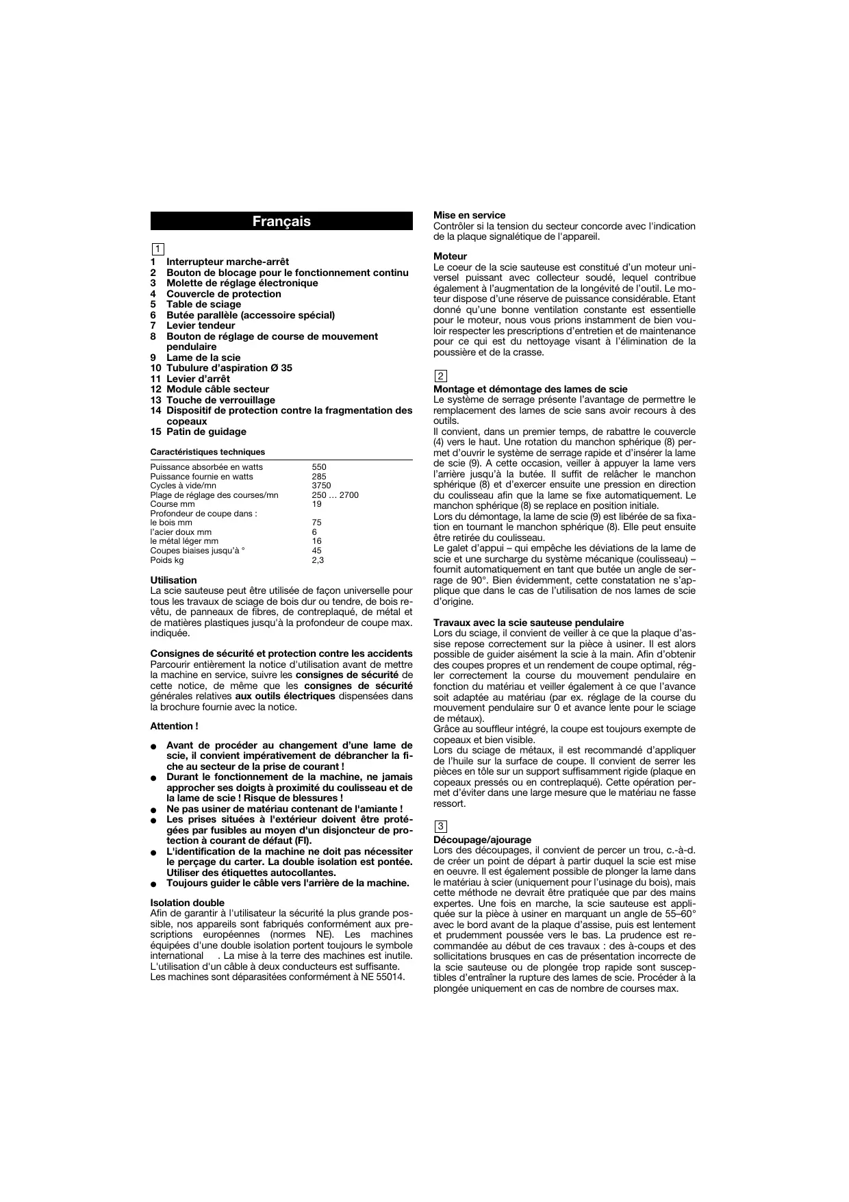 Interrupteur marche-arrêt Bouton de blocage pour le fonctionnement continu Molette de réglage électronique Couvercle de protection Table de sciage Butée parallèle (accessoire spécial) Levier tendeur Bouton de réglage de course de mouvement pendulaire Lame de la scie Tubulure d’aspiration Ø 35 Levier d’arrêt Module câble secteur Touche de verrouillage Dispositif de protection contre la fragmentation des copeaux Patin de guidage Caractéristiques techniques Puissance absorbée en watts Puissance fournie en watts Cycles à vide/mn Plage de réglage des courses/mn Course mm Profondeur de coupe dans : le bois mm l’acier doux mm le métal léger mm Coupes biaises jusqu’à ° Poids kg