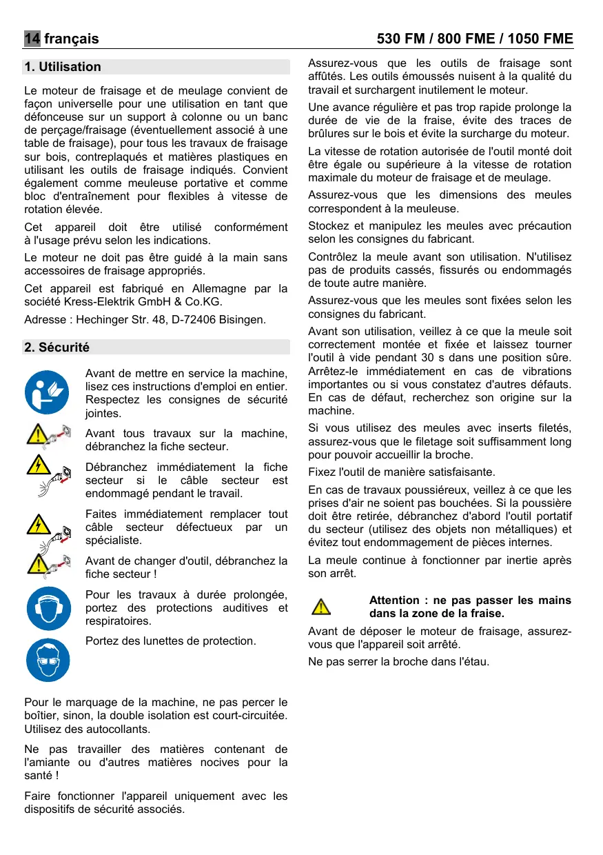 Moteur de fraisage et de meulage 14-18 Assurez-vous que les outils de fraisage sont affûtés. Les outils émoussés nuisent à la qualité du travail et surchargent inutilement le moteur. Le moteur de fraisage et de meulage convient de façon universelle pour une utilisation en tant que défonceuse sur un support à colonne ou un banc de perçage/fraisage (éventuellement associé à une table de fraisage), pour tous les travaux de fraisage sur bois, contreplaqués et matières plastiques en utilisant les outils de fraisage indiqués. Convient également comme meuleuse portative et comme bloc d'entraînement pour flexibles à vitesse de rotation élevée. Une avance régulière et pas trop rapide prolonge la durée de vie de la fraise, évite des traces de brûlures sur le bois et évite la surcharge du moteur. La vitesse de rotation autorisée de l'outil monté doit être égale ou supérieure à la vitesse de rotation maximale du moteur de fraisage et de meulage. Assurez-vous que les dimensions des meules correspondent à la meuleuse. Cet appareil doit être utilisé conformément à l'usage prévu selon les indications. Stockez et manipulez les meules avec précaution selon les consignes du fabricant. Le moteur ne doit pas être guidé à la main sans accessoires de fraisage appropriés. Contrôlez la meule avant son utilisation. N'utilisez pas de produits cassés, fissurés ou endommagés de toute autre manière. Cet appareil est fabriqué en Allemagne par la société Kress-Elektrik GmbH & Co.KG. Adresse : Hechinger Str. 48, D-72406 Bisingen.