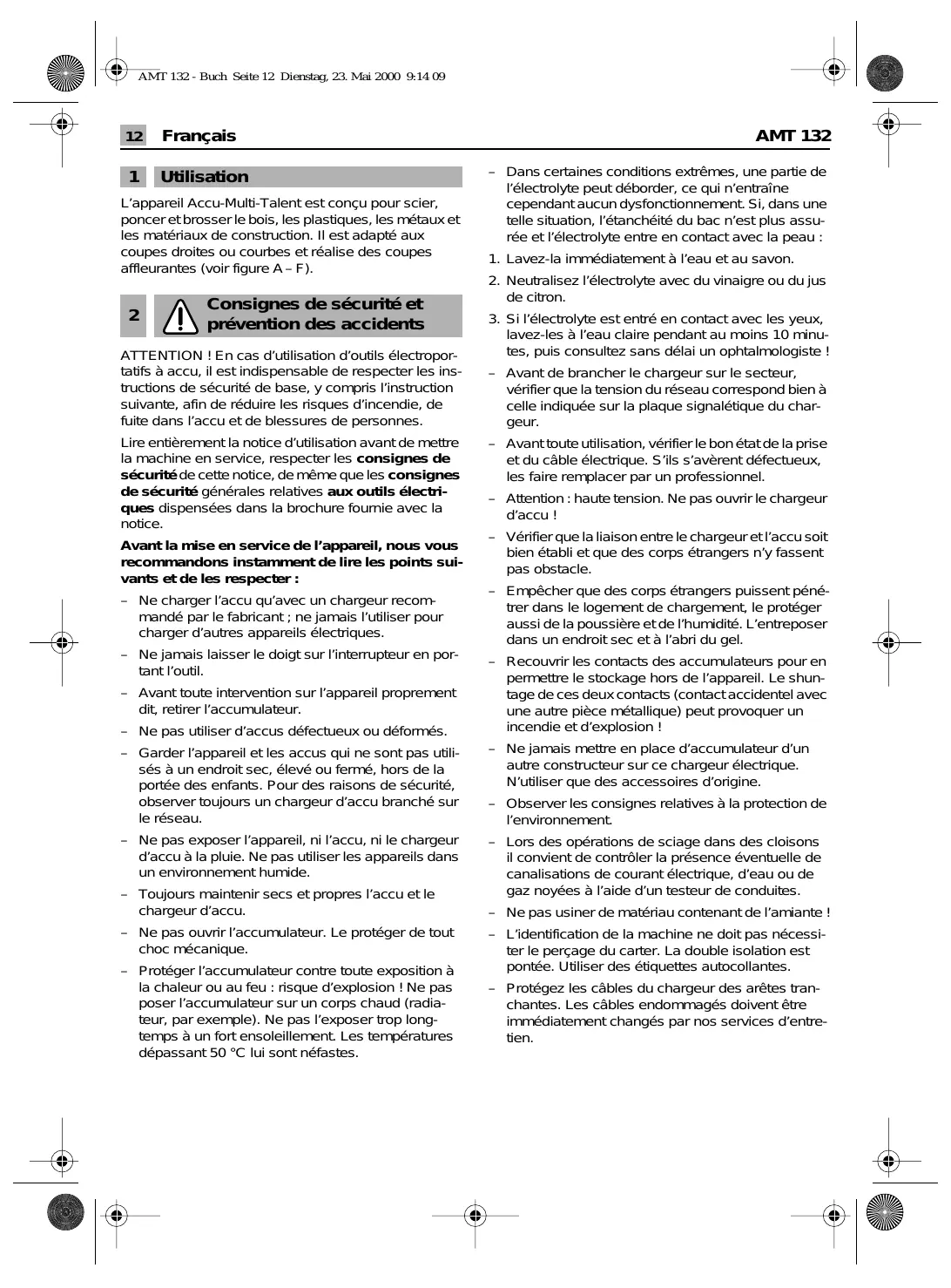 Consignes de sécurité et prévention des accidents ATTENTION ! En cas d’utilisation d’outils électroportatifs à accu, il est indispensable de respecter les instructions de sécurité de base, y compris l’instruction suivante, afin de réduire les risques d’incendie, de fuite dans l’accu et de blessures de personnes. Lire entièrement la notice d’utilisation avant de mettre la machine en service, respecter les consignes de sécurité de cette notice, de même que les consignes de sécurité générales relatives aux outils électriques dispensées dans la brochure fournie avec la notice. Avant la mise en service de l’appareil, nous vous recommandons instamment de lire les points suivants et de les respecter : – Ne charger l’accu qu’avec un chargeur recommandé par le fabricant ; ne jamais l’utiliser pour charger d’autres appareils électriques. – Ne jamais laisser le doigt sur l’interrupteur en portant l’outil. – Avant toute intervention sur l’appareil proprement dit, retirer l’accumulateur. – Ne pas utiliser d’accus défectueux ou déformés. – Garder l’appareil et les accus qui ne sont pas utilisés à un endroit sec, élevé ou fermé, hors de la portée des enfants. Pour des raisons de sécurité, observer toujours un chargeur d’accu branché sur le réseau. – Ne pas exposer l’appareil, ni l’accu, ni le chargeur d’accu à la pluie. Ne pas utiliser les appareils dans un environnement humide. – Toujours maintenir secs et propres l’accu et le chargeur d’accu. – Ne pas ouvrir l’accumulateur. Le protéger de tout choc mécanique. – Protéger l’accumulateur contre toute exposition à la chaleur ou au feu : risque d’explosion ! Ne pas poser l’accumulateur sur un corps chaud (radiateur, par exemple). Ne pas l’exposer trop longtemps à un fort ensoleillement. Les températures dépassant 50 °C lui sont néfastes. AMT 132 – Dans certaines conditions extrêmes, une partie de l’électrolyte peut déborder, ce qui n’entraîne cependant aucun dysfonctionnement. Si, dans une telle situation, l’étanchéité du bac n’est plus assurée et l’électrolyte entre en contact avec la peau :