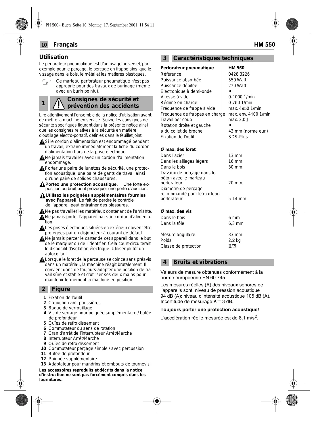 Utilisation 3 Caractéristiques techniques Le perforateur pneumatique est d'un usage universel, par . exemple pour le perçage, le perçage en frappe ainsi que le Perforateur pneumatique HM 550 vissage dans le bois, le métal etles matières plastiques Référence 0428 3226 Ce marteau perforateur pneumatique n'estpas Puissance absorbée 550 Watt approprié pour des travaux de burinage (même Puissance débitée 270 Watt avec un burin pointu) Electronique à demi-onde . Vitesse à vide 0-1000 1/min 1 IN Consignes de sécurité et Régime en charge 0-750 1/min prévention des accidents Lire attentivement l'ensemble de la notice d'utilisation avant de mettre la machine en service. Suivre les consignes de sécurité spécifiques figurant dans la présente notice ainsi que les consignes relatives à la sécurité en matière d'outillage électro-portatif, définies dans le feuillet joint. Aile cordon d'alimentation est endommagé pendant Un travail, extraire immédiatement la fiche du cordon d'alimentation hors de la prise électrique Àe jamais travailler avec un cordon d'alimentation ‘endommagé Porter une paire de lunettes de sécurité, une protec- tion acoustique, une paire de gants de travail ainsi qu'une paire de solides chaussures. Portez une protection acoustique. _ Une forte ex- position au bruit peut provoquer une perte d'audition. AUtilisez les poignées supplémentaires fournies avec l'appareil. Le fait de perdre le contrôle de l'appareil peut entraîner des blessures. Ne pas travailler les matériaux contenant de l'amiante Ne jamais porter l'appareil par son cordon d'alimenta- tion. ces prises électriques situées en extérieur doivent être protégées par un disjoncteur à courant de défaut. À Ne jamais percer le carter de cet appareil dans le but de le marquer ou de l'identifier. Cela court-circuiterait le dispositif d'isolation électrique. Utiliser plutôt un autocollant. ÀLorsque le foret de la perceuse se coince sans préavis dans un matériau, la machine réagit brutalement. 11 convient donc de toujours adopter une position de tra- vail sûre et stable et d'utiliser ses deux mains pour maintenir fermement là machine en position. 21 Figure 1 Fixation de l'outil 2 Capuchon anti-poussières 3 Bague de verrouillage 4 Vis de serrage pour poignée supplémentaire / butée de profondeur 5 Ouïes de refroidissement 6 Commutateur du sens de rotation 7 Cran d'arrêt de l'interrupteur Arrêt/Marche 8 Interrupteur ArrêtMarche 9 Ouïes de refroidissement 10 Commutateur perçage simple / avec percussion 11 Butée de profondeur 12 Poignée supplémentaire 13 Adaptateur pour mandrins et embouts de tournevis Les accessoires reproduits et décrits dans la notice d'instruction ne sont pas forcément compris dans les fournitures. Fréquence de frappe à vide Fréquence de frappes en chargé Travail per coup Rotation droite et gauche 2 du collet de broche Fixation de l'outil 9 max. des foret Dans l'acier Dans les alliages légers Dans le bois Travaux de perçage dans le béton avec le marteau perforateur Diamètre de perçage recommandé pour le marteau perforateur © max. des vis Dans le bois Dans la tôle Mesure angulaire Poids Classe de protection 4 Bruits et vibrations max. 4950 1/min max. env. 4100 1/min max. 2,0]