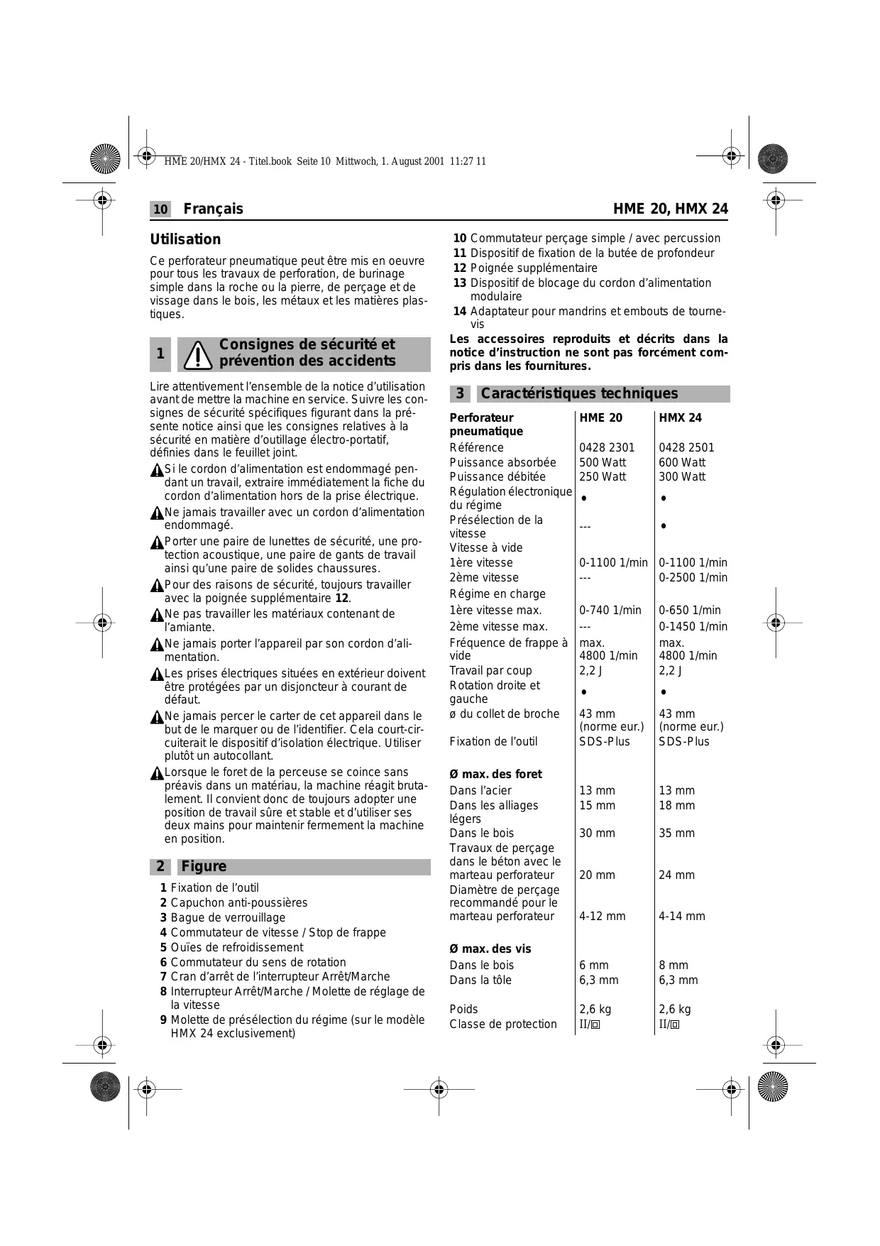7 HME 20/HMX 24 - Titel.book Seite 10 Mitiwoch, 1. August 2001 11:27 11 / HME 20, HMX 24 Utilisation Ce perforateur pneumatique peut être mis en oeuvre pour tous les travaux de perforation, de burinage Simple dans la roche ou la pierre, de perçage et de vissage dans le bois, les métaux et les matières plas- tiques.