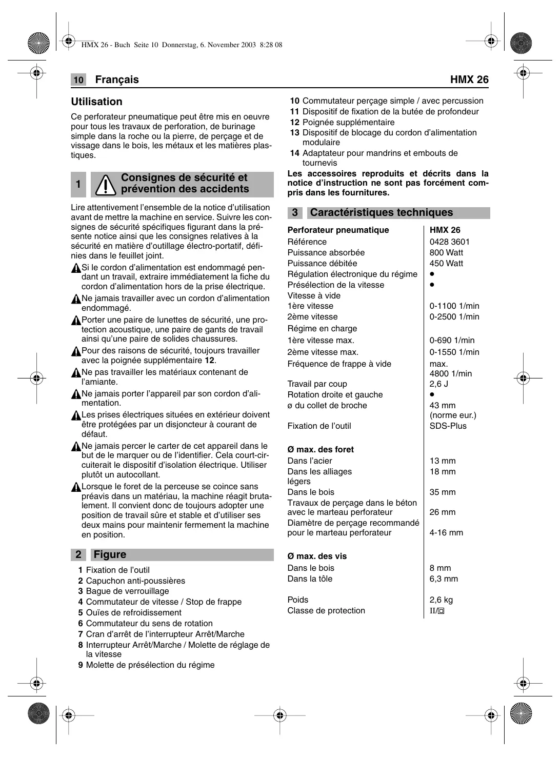 HMX 26 - Buch Seite 10 Donnerstag, 6. November 2003 8:28 08 ‘0: Français HMX 26 Utilisation Ce perforateur pneumatique peut être mis en oeuvre pour tous les travaux de perforation, de burinage simple dans la roche ou la pierre, de perçage et de vissage dans le bois, les métaux et les matières plas- tiques. Consignes de sécurité et prévention des accidents Lire attentivement l'ensemble de la notice d'utilisation avant de mettre la machine en service. Suivre les con- signes de sécurité spécifiques figurant dans la pré- sente notice ainsi que les consignes relatives à la sécurité en matière d'outillage électro-portatif, défi- nies dans le feuillet joint. A Si le cordon d'alimentation est endommagé pen- dant un travail, extraire immédiatement la fiche du cordon d'alimentation hors de la prise électrique. Âne jamais travailler avec un cordon d'alimentation ‘endommagé. À Porter une paire de lunettes de sécurité, une pro- tection acoustique, une paire de gants de travail ainsi qu'une paire de solides chaussures. APour des raisons de sécurité, toujours travailler avec la poignée supplémentaire 12. ÂNe pas travailler les matériaux contenant de l'amiante. A jamais porter l'appareil par son cordon d'ali- mentation. Âss prises électriques situées en extérieur doivent être protégées par un disjoncteur à courant de défaut. Ane jamais percer le carter de cet appareil dans le but de le marquer ou de l'identifier. Cela court-cir- cuiterait le dispositif d'isolation électrique. Utiliser plutôt un autocollant. ALorsque le foret de la perceuse se coince sans préavis dans un matériau, la machine réagit bruta- lement. 1! convient donc de toujours adopter une position de travail sûre et stable et d'utiliser ses deux mains pour maintenir fermement la machine en position. 2 Figure 1 Fixation de l'outil 2 Capuchon anti-poussières 3 Bague de verrouillage 4 Commutateur de vitesse / Stop de frappe 5 Ouïes de refroidissement 6 Commutateur du sens de rotation 7 Cran d'arrêt de l'interrupteur Arrêt/Marche 8 Interrupteur Arrêt/Marche / Molette de réglage de la vitesse 9 Molette de présélection du régime 10 Commutateur perçage simple / avec percussion 11 Dispositif de fixation de la butée de profondeur 12 Poignée supplémentaire 13 Dispositif de blocage du cordon d'alimentation modulaire 14 Adaptateur pour mandrins et embouts de tournevis Les accessoires reproduits et décrits dans la notice d'instruction ne sont pas forcément com- pris dans les fournitures. 3 Caractéristiques techniques Perforateur pneumatique HMX 26 Référence 0428 3601 Puissance absorbée 800 Watt Puissance débitée 450 Watt Régulation électronique du régime | « Présélection de la vitesse . Vitesse à vide 1ère vitesse 0-1100 t/min 2ème vitesse 0-2500 1/min Régime en charge 1ère vitesse max. 0-690 1/min 2ème vitesse max. 0-1550 t/min Fréquence de frappe à vide max. 4800 1/min Travail par coup 26J Rotation droite et gauche . 9 du collet de broche 43 mm (norme eur.) Fixation de l'outil SDS-Plus © max. des foret Dans l'acier 13 mm Dans les alliages 18 mm légers Dans le bois 35 mm Travaux de perçage dans le béton avec le marteau perforateur 26 mm Diamètre de perçage recommandé pour le marteau perforateur 4-16 mm © max. des vis Dans le bois 8 mm Dans la tôle 6,3 mm Poids 2,6 kg Classe de protection IG