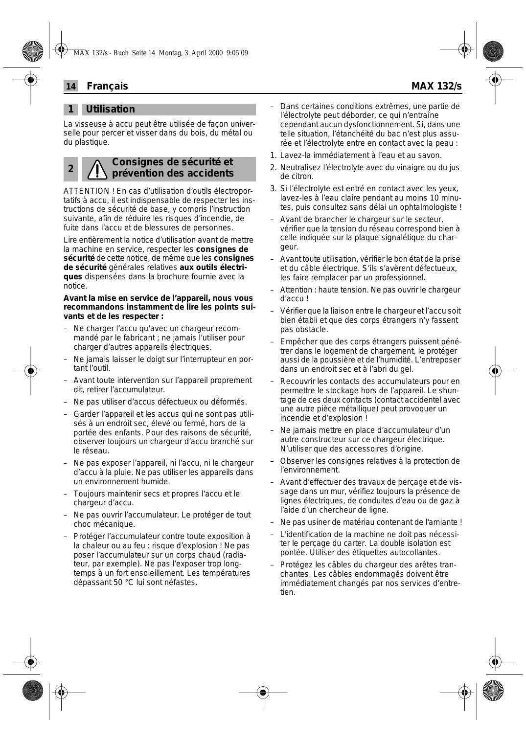 Consignes de sécurité et prévention des accidents ATTENTION ! En cas d’utilisation d’outils électroportatifs à accu, il est indispensable de respecter les instructions de sécurité de base, y compris l’instruction suivante, afin de réduire les risques d’incendie, de fuite dans l’accu et de blessures de personnes. Lire entièrement la notice d’utilisation avant de mettre la machine en service, respecter les consignes de sécurité de cette notice, de même que les consignes de sécurité générales relatives aux outils électriques dispensées dans la brochure fournie avec la notice. Avant la mise en service de l’appareil, nous vous recommandons instamment de lire les points suivants et de les respecter : – Ne charger l’accu qu’avec un chargeur recommandé par le fabricant ; ne jamais l’utiliser pour charger d’autres appareils électriques. – Ne jamais laisser le doigt sur l’interrupteur en portant l’outil. – Avant toute intervention sur l’appareil proprement dit, retirer l’accumulateur. – Ne pas utiliser d’accus défectueux ou déformés. – Garder l’appareil et les accus qui ne sont pas utilisés à un endroit sec, élevé ou fermé, hors de la portée des enfants. Pour des raisons de sécurité, observer toujours un chargeur d’accu branché sur le réseau. – Ne pas exposer l’appareil, ni l’accu, ni le chargeur d’accu à la pluie. Ne pas utiliser les appareils dans un environnement humide. – Toujours maintenir secs et propres l’accu et le chargeur d’accu. – Ne pas ouvrir l’accumulateur. Le protéger de tout choc mécanique. – Protéger l’accumulateur contre toute exposition à la chaleur ou au feu : risque d’explosion ! Ne pas poser l’accumulateur sur un corps chaud (radiateur, par exemple). Ne pas l’exposer trop longtemps à un fort ensoleillement. Les températures dépassant 50 °C lui sont néfastes. MAX 132/s – Dans certaines conditions extrêmes, une partie de l’électrolyte peut déborder, ce qui n’entraîne cependant aucun dysfonctionnement. Si, dans une telle situation, l’étanchéité du bac n’est plus assurée et l’électrolyte entre en contact avec la peau :