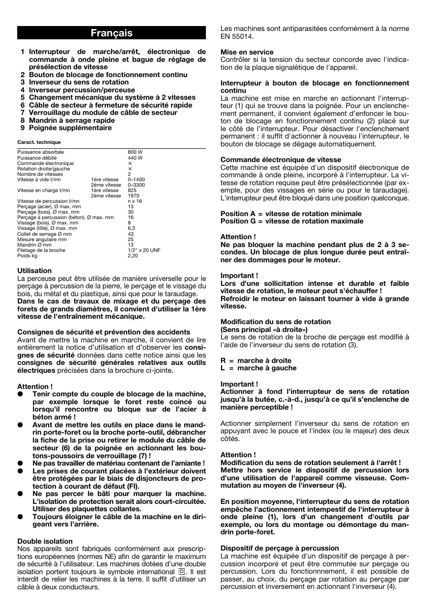 1/2" x 20 UNF 2,20 Utilisation La perceuse peut être utilisée de manière universelle pour le perçage à percussion de la pierre, le perçage et le vissage du bois, du métal et du plastique, ainsi que pour le taraudage. Dans le cas de travaux de mixage et du perçage des forets de grands diamètres, il convient d'utiliser la 1ère vitesse de l'entraînement mécanique. Consignes de sécurité et prévention des accidents Avant de mettre la machine en marche, il convient de lire entièrement la notice d’utilisation et d’observer les consignes de sécurité données dans cette notice ainsi que les consignes de sécurité générales relatives aux outils électriques précisées dans la brochure ci-jointe. Attention ! ● Tenir compte du couple de blocage de la machine, par exemple lorsque le foret reste coincé ou lorsqu’il rencontre ou bloque sur de l’acier à béton armé ! ● Avant de mettre les outils en place dans le mandrin porte-foret ou la broche porte-outil, débrancher la fiche de la prise ou retirer le module du câble de secteur (6) de la poignée en actionnant les boutons-poussoirs de verrouillage (7) ! ● Ne pas travailler de matériau contenant de l’amiante ! ● Les prises de courant placées à l’extérieur doivent être protégées par le biais de disjoncteurs de protection à courant de défaut (FI). ● Ne pas percer le bâti pour marquer la machine. L’isolation de protection serait alors court-circuitée. Utiliser des plaquettes collantes. ● Toujours éloigner le câble de la machine en le dirigeant vers l’arrière. Double isolation Nos appareils sont fabriqués conformément aux prescriptions européennes (normes NE) afin de garantir le maximum de sécurité à l’utilisateur. Les machines dotées d’une double isolation portent toujours le symbole international . Il est interdit de relier les machines à la terre. Il suffit d’utiliser un câble à deux conducteurs. Interrupteur à bouton de blocage en fonctionnement continu La machine est mise en marche en actionnant l'interrupteur (1) qui se trouve dans la poignée. Pour un enclenchement permanent, il convient également d’enfoncer le bouton de blocage en fonctionnement continu (2) placé sur le côté de l’interrupteur. Pour désactiver l'enclenchement permanent : il suffit d'actionner à nouveau l'interrupteur, le bouton de blocage se dégage automatiquement. Commande électronique de vitesse Cette machine est équipée d'un dispositif électronique de commande à onde pleine, incorporé à l'interrupteur. La vitesse de rotation requise peut être présélectionnée (par exemple, pour des vissages en série ou pour le taraudage). L'interrupteur peut être bloqué dans une position quelconque. Position A = vitesse de rotation minimale Position G = vitesse de rotation maximale Attention ! Ne pas bloquer la machine pendant plus de 2 à 3 secondes. Un blocage de plus longue durée peut entraîner des dommages pour le moteur. Important ! Lors d'une sollicitation intense et durable et faible vitesse de rotation, le moteur peut s'échauffer ! Refroidir le moteur en laissant tourner à vide à grande vitesse. Modification du sens de rotation (Sens principal «à droite») Le sens de rotation de la broche de perçage est modifié à l’aide de l’inverseur du sens de rotation (3). R = marche à droite L = marche à gauche Important ! Actionner à fond l’interrupteur de sens de rotation jusqu’à la butée, c.-à-d., jusqu’à ce qu’il s’enclenche de manière perceptible ! Actionner simplement l’inverseur du sens de rotation en appuyant avec le pouce et l'index (ou le majeur) des deux côtés. Attention ! Modification du sens de rotation seulement à l'arrêt ! Mettre hors service le dispositif de percussion lors d'une utilisation de l'appareil comme visseuse. Commutation au moyen de l'inverseur (4). En position moyenne, l'interrupteur du sens de rotation empêche l'actionnement intempestif de l'interrupteur à onde pleine (1), lors d'un changement d'outils par exemple, ou lors du montage ou démontage du mandrin porte-foret. Dispositif de perçage à percussion La machine est équipée d'un dispositif de perçage à percussion incorporé et peut être commutée sur perçage ou percussion. Lors du fonctionnnement, il est possible de passer, au choix, du perçage par rotation au perçage par percussion et inversement en actionnant l'inverseur (4). Position perçage : Pousser l'inverseur (4) vers la droite dans la direction perçage. Position perçage par percussion : Pousser l'inverseur (4) vers la gauche dans la direction percussion. Vis Il est possible de monter les embouts de tournevis (Bits) directement dans le mandrin. Il est recommandé d’utiliser des vis à empreinte cruciforme. Le centrage automatique garantit un travail en toute sécurité. Veiller également à ce que les embouts de tournevis appropriés soient respectivement utilisés. Changement mécanique du système à 2 vitesses Le changement de vitesse s'effectue en tournant la manette (5). Position 1 = régime lent Position 2 = régime rapide Le changement du système à deux vitesses présente des avantages lors du perçage et du perçage par percussion avec des forets de petits diamètres jusqu'à environ 8 mm : vitesse sélectionnée = position de l'interrupteur sur 2. Pour de plus grands diamètres, et pour les travaux de mixage : vitesse sélectionnée = position de l'interrupteur sur 1. Taraudage Grâce au variateur électronique incorporé et à l'inverseur de sens de rotation, la perceuse à percussion convient aussi pour le taraudage. Il est recommandé d'utiliser des tarauds pour taraudage à la machine. Serrer le taraud dans le mandrin. Il convient alors de manipuler le variateur élec-tronique avec doigté et avec les précautions nécessaires, pour éviter une rupture des tarauds – particulièrement lorsque les taraudages sont effectués dans des trous borgnes. Le couple de rotation nécessaire peu