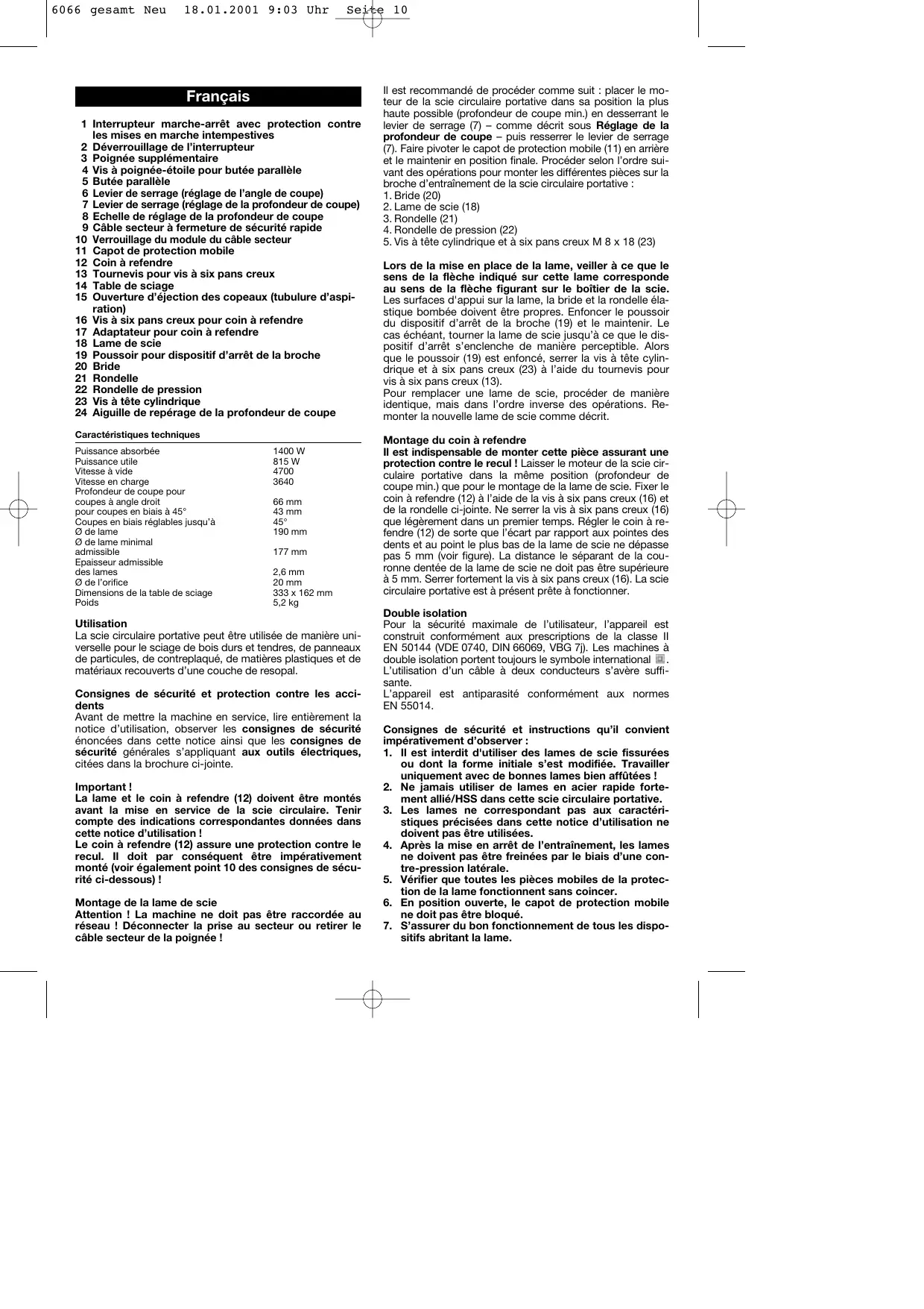 Français 1 Interrupteur marche-arrêt avec protection contre les mises en marche intempestives 2 Déverrouillage de l’interrupteur 3 Poignée supplémentaire 4 Vis à poignée-étoile pour butée parallèle 5 Butée parallèle 6 Levier de serrage (réglage de l’angle de coupe) 7 Levier de serrage (réglage de la profondeur de coupe) 8 Echelle de réglage de la profondeur de coupe 9 Câble secteur à fermeture de sécurité rapide 10 Verrouillage du module du câble secteur 11 Capot de protection mobile 12 Coin à refendre 13 Tournevis pour vis à six pans creux 14 Table de sciage 15 Ouverture d’éjection des copeaux (tubulure d’aspiration) 16 Vis à six pans creux pour coin à refendre 17 Adaptateur pour coin à refendre 18 Lame de scie 19 Poussoir pour dispositif d’arrêt de la broche 20 Bride 21 Rondelle 22 Rondelle de pression 23 Vis à tête cylindrique 24 Aiguille de repérage de la profondeur de coupe Caractéristiques techniques Puissance absorbée Puissance utile Vitesse à vide Vitesse en charge Profondeur de coupe pour coupes à angle droit pour coupes en biais à 45° Coupes en biais réglables jusqu’à Ø de lame Ø de lame minimal admissible Epaisseur admissible des lames Ø de l’orifice Dimensions de la table de sciage Poids Utilisation La scie circulaire portative peut être utilisée de manière universelle pour le sciage de bois durs et tendres, de panneaux de particules, de contreplaqué, de matières plastiques et de matériaux recouverts d’une couche de resopal. Consignes de sécurité et protection contre les accidents Avant de mettre la machine en service, lire entièrement la notice d’utilisation, observer les consignes de sécurité énoncées dans cette notice ainsi que les consignes de sécurité générales s’appliquant aux outils électriques, citées dans la brochure ci-jointe. Important ! La lame et le coin à refendre (12) doivent être montés avant la mise en service de la scie circulaire. Tenir compte des indications correspondantes données dans cette notice d’utilisation ! Le coin à refendre (12) assure une protection contre le recul. Il doit par conséquent être impérativement monté (voir également point 10 des consignes de sécurité ci-dessous) ! Montage de la lame de scie Attention ! La machine ne doit pas être raccordée au réseau ! Déconnecter la prise au secteur ou retirer le câble secteur de la poignée ! Il est recommandé de procéder comme suit : placer le moteur de la scie circulaire portative dans sa position la plus haute possible (profondeur de coupe min.) en desserrant le levier de serrage (7) – comme décrit sous Réglage de la profondeur de coupe – puis resserrer le levier de serrage (7). Faire pivoter le capot de protection mobile (11) en arrière et le maintenir en position finale. Procéder selon l’ordre suivant des opérations pour monter les différentes pièces sur la broche d’entraînement de la scie circulaire portative :