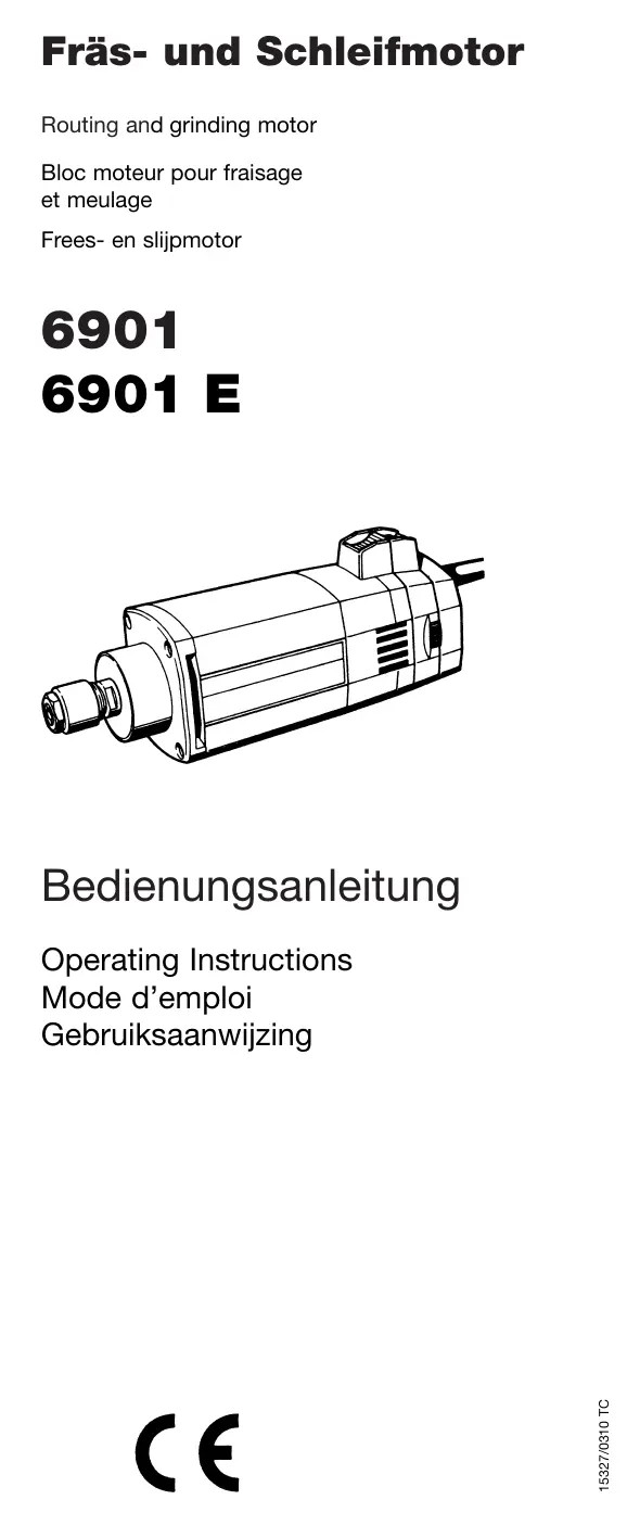 Système électronique de régulation à onde pleine 6901 E (système électronique de sécurité) Le système électronique de régulation à onde pleine permet une vaste plage de réglage comprise entre 8000 et 24000/min. La vitesse de rotation ne diminue que très légèrement (à env. 22500/min.), même à la puissance nominale. On peut donc toujours choisir la vitesse de coupe ou de rotation optimale, indépendamment : – du matériau (par ex. : bois dur, bois tendre, matière plastique) et – de l’outil de fraisage ou de meulage (par ex. petit diamètre, grand diamètre, basse qualité, haute qualité). Grâce à la limitation de la vitesse de rotation à vide, l’appareil ne produit pas de pollution sonore. On peut consulter les vitesses de rotation à vide dans le tableau situé sur la machine. Les vitesses de coupe ou de rotation sont fonction de très nombreux facteurs (par ex. dureté différente du matériau à usiner, qualité de la fraise, avance, etc.), de sorte qu’une recommandation, en ce qui concerne le réglage de la vitesse de rotation, ne peut être donnée. Il faut déterminer le réglage optimal de la vitesse de rotation en procédant à des essais au début des travaux de fraisage. Remarque ! Des vitesses de rotation très élevées sont synonymes d’usure rapide et de courte durée de vie des outils ! Important ! N’utiliser que des outils de fraisage bien affûtés et en bon état ! Veiller à ne pas dépasser les vitesse de rotation par minute toujours indiquées sur les outils rotatifs par le fabricant ! Système électronique de sécurité 6901 E Un palpeur électronique d’électricité est intégré dans le système de régulation à onde pleine. Si le moteur subit une surcharge dûe à une trop grande pression ou un coincement, le système