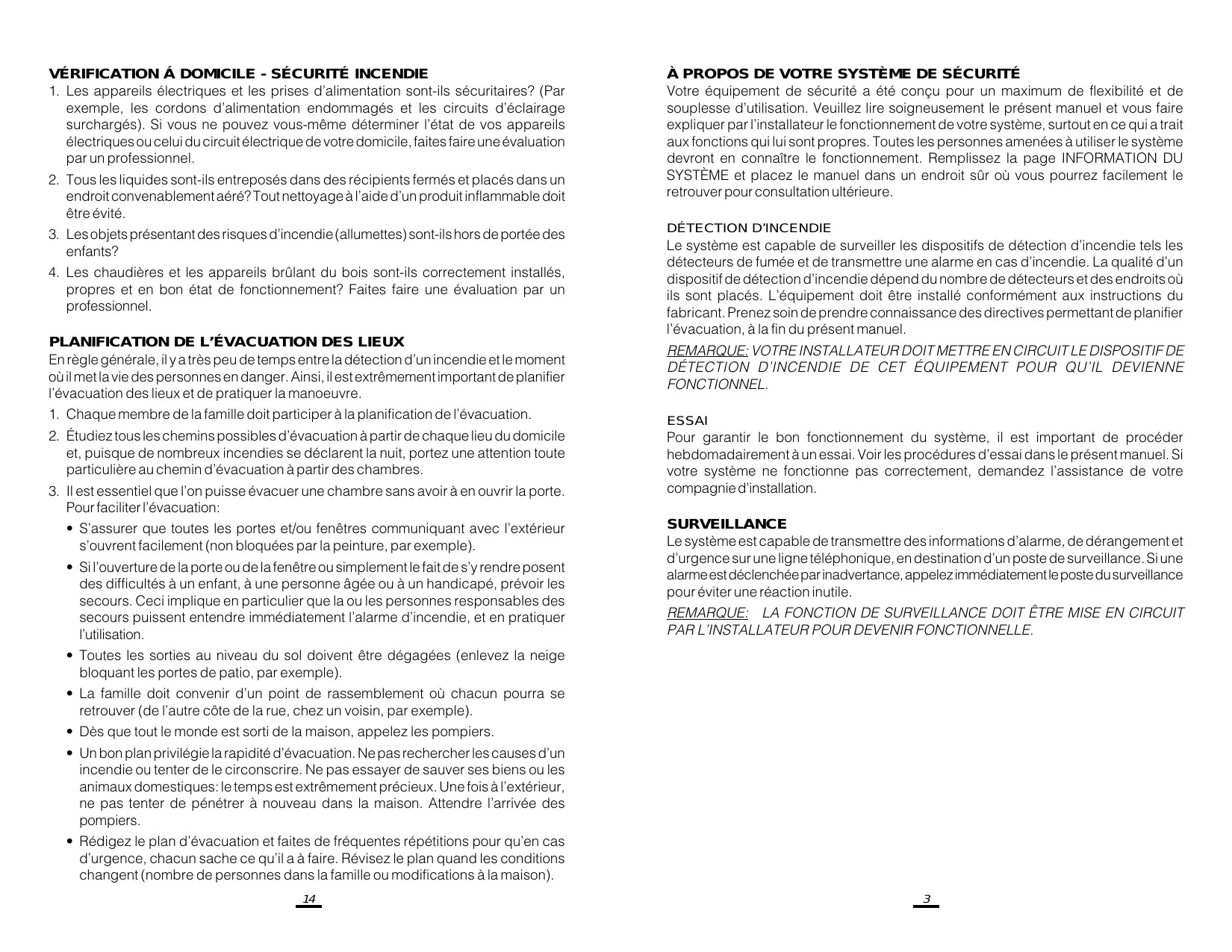 Le système est capable de surveiller les dispositifs de détection d’incendie tels les détecteurs de fumée et de transmettre une alarme en cas d’incendie. La qualité d’un dispositif de détection d’incendie dépend du nombre de détecteurs et des endroits où ils sont placés. L’équipement doit être installé conformément aux instructions du fabricant. Prenez soin de prendre connaissance des directives permettant de planifier l’évacuation, à la fin du présent manuel. REMARQUE: VOTRE INSTALLATEUR DOIT METTRE EN CIRCUIT LE DISPOSITIF DE DÉTECTION D’INCENDIE DE CET ÉQUIPEMENT POUR QU’IL DEVIENNE FONCTIONNEL. ESSAI Pour garantir le bon fonctionnement du système, il est important de procéder hebdomadairement à un essai. Voir les procédures d’essai dans le présent manuel. Si votre système ne fonctionne pas correctement, demandez l’assistance de votre compagnie d’installation. SURVEILLANCE Le système est capable de transmettre des informations d’alarme, de dérangement et d’urgence sur une ligne téléphonique, en destination d’un poste de surveillance. Si une alarme est déclenchée par inadvertance, appelez immédiatement le poste du surveillance pour éviter une réaction inutile. REMARQUE: LA FONCTION DE SURVEILLANCE DOIT ÊTRE MISE EN CIRCUIT PAR L’INSTALLATEUR POUR DEVENIR FONCTIONNELLE.