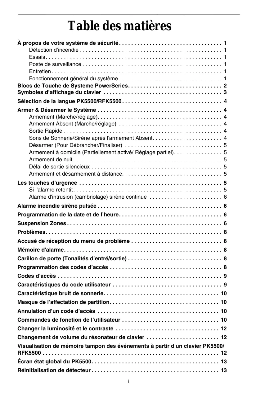 Sélection de la langue PK5500/RFK5500 . . . . . . . . . . . . . . . . . . . . . . . . . . . . . . . . . 4 Armer & Désarmer le Système . . . . . . . . . . . . . . . . . . . . . . . . . . . . . . . . . . . . . . . . . Armement (Marche/réglage). . . . . . . . . . . . . . . . . . . . . . . . . . . . . . . . . . . . . . . . . Armement Absent (Marche/réglage) . . . . . . . . . . . . . . . . . . . . . . . . . . . . . . . . . . Sortie Rapide . . . . . . . . . . . . . . . . . . . . . . . . . . . . . . . . . . . . . . . . . . . . . . . . . . . . Sons de Sonnerie/Sirène après l'armement Absent. . . . . . . . . . . . . . . . . . . . . . . Désarmer (Pour Débrancher/Finaliser) . . . . . . . . . . . . . . . . . . . . . . . . . . . . . . . . Armement à domicile (Partiellement activé/ Réglage partiel). . . . . . . . . . . . . . . . Armement de nuit . . . . . . . . . . . . . . . . . . . . . . . . . . . . . . . . . . . . . . . . . . . . . . . . . Délai de sortie silencieux . . . . . . . . . . . . . . . . . . . . . . . . . . . . . . . . . . . . . . . . . . . Armement et désarmement à distance. . . . . . . . . . . . . . . . . . . . . . . . . . . . . . . . .