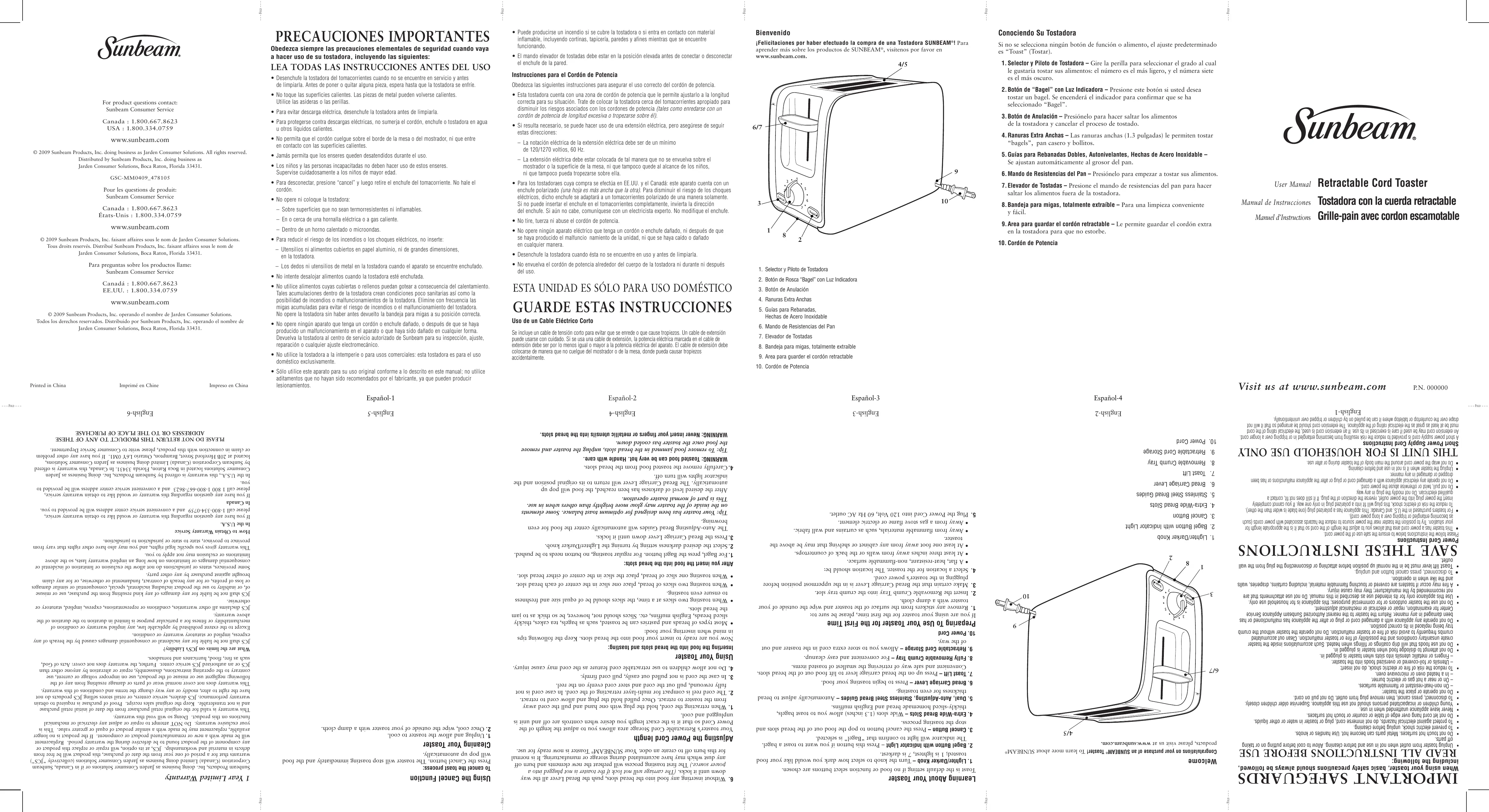 Enlevez souvent les miettes qui s'accumulent dans le ramasse-miettes pour prévenir incidénies et pannes. N'employez jamais le Grille-pain sans que le ramasse-miettes ne soit en place. - Nutilissez pas un apparéil équité d'un cordon ou d'une fiche abimé, qui a mal fonctionné ou a été endommage de quelque façon. Retournée-le au centre de service Sunbeam agréé le plus proche pour lui faisubir les contrôles, réparations ou réglages水电iciques ou mécaniques nécessaires.