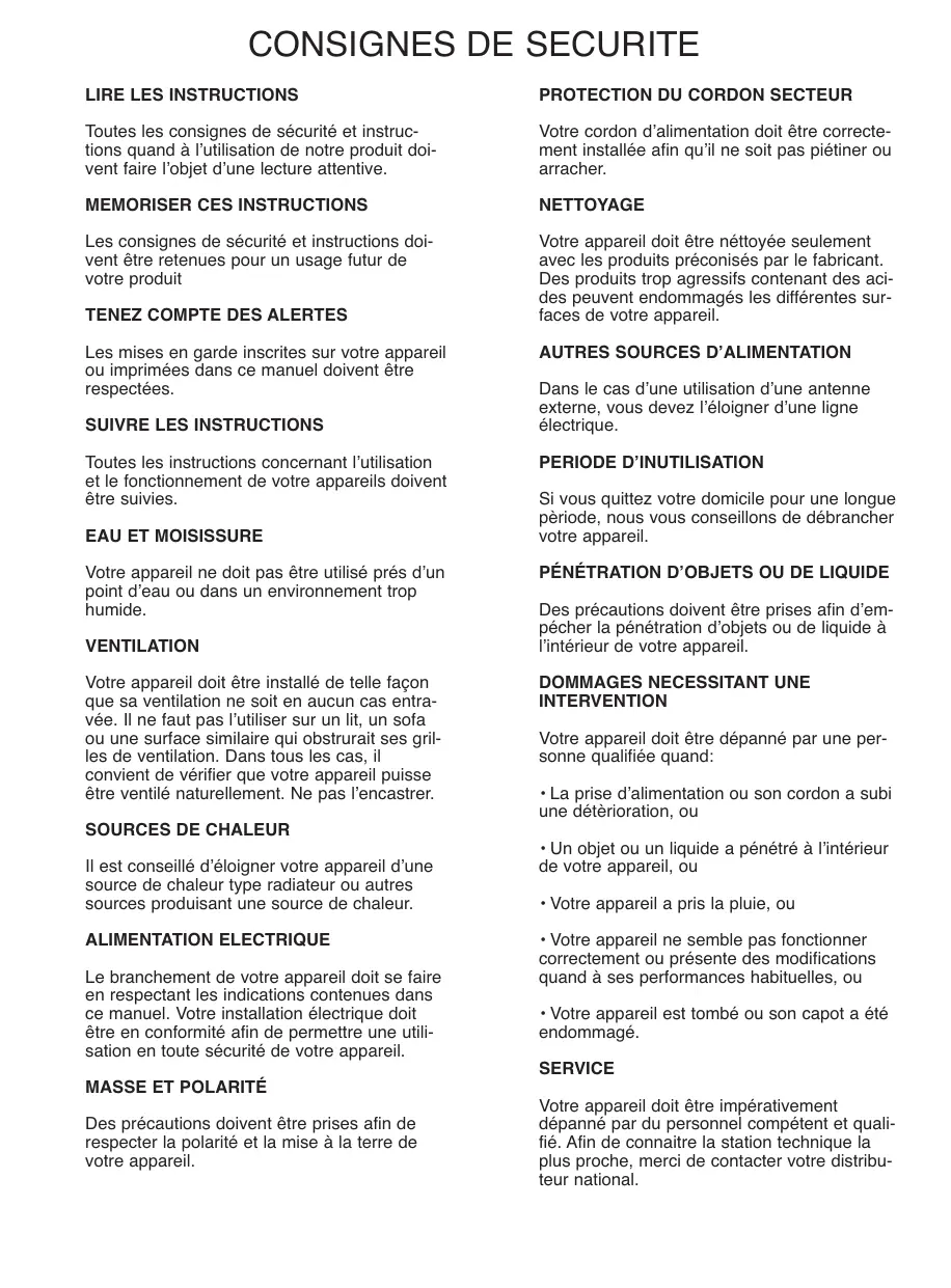 Toutes les consignes de sécurité et instructions quand à l’utilisation de notre produit doivent faire l’objet d’une lecture attentive. Votre cordon d’alimentation doit être correctement installée afin qu’il ne soit pas piétiner ou arracher.