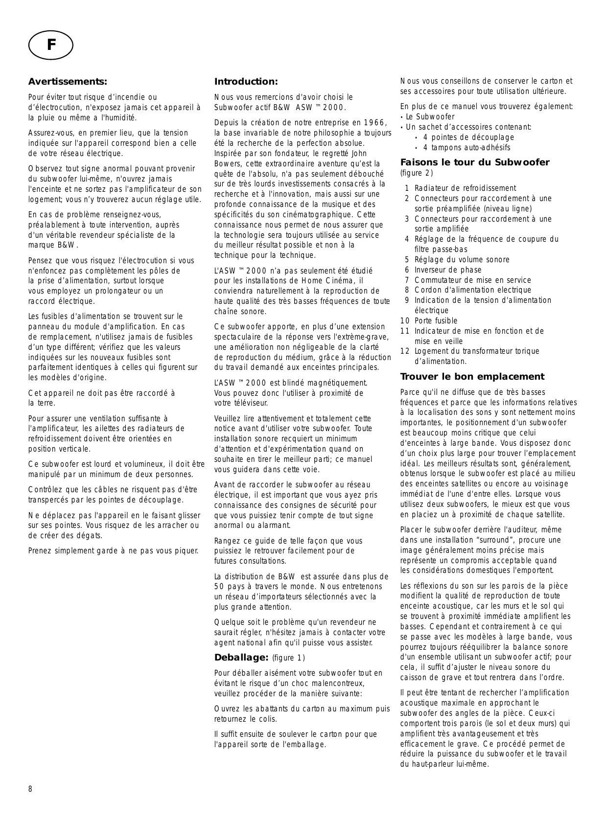 été la recherche de la perfection absolue. Inspirée par son fondateur, le regretté John Bowers, cette extraordinaire aventure qu’est la quête de l'absolu, n'a pas seulement débouché sur de très lourds investissements consacrés à la recherche et à l'innovation, mais aussi sur une profonde connaissance de la musique et des spécificités du son cinématographique. Cette connaissance nous permet de nous assurer que la technologie sera toujours utilisée au service du meilleur résultat possible et non à la technique pour la technique. L'ASW™2000 n’a pas seulement été étudié pour les installations de Home Cinéma, il conviendra naturellement à la reproduction de haute qualité des très basses fréquences de toute chaîne sonore. Ce subwoofer apporte, en plus d’une extension spectaculaire de la réponse vers l'extrème-grave, une amélioration non négligeable de la clarté de reproduction du médium, grâce à la réduction du travail demandé aux enceintes principales. L’ASW™2000 est blindé magnétiquement. Vous pouvez donc l'utiliser à proximité de votre téléviseur. Veuillez lire attentivement et totalement cette notice avant d'utiliser votre subwoofer. Toute installation sonore recquiert un minimum d'attention et d'expérimentation quand on souhaite en tirer le meilleur parti; ce manuel vous guidera dans cette voie. Avant de raccorder le subwoofer au réseau électrique, il est important que vous ayez pris connaissance des consignes de sécurité pour que vous puissiez tenir compte de tout signe anormal ou alarmant. Rangez ce guide de telle façon que vous puissiez le retrouver facilement pour de futures consultations. La distribution de B&W est assurée dans plus de 50 pays à travers le monde. Nous entretenons un réseau d’importateurs sélectionnés avec la plus grande attention. Quelque soit le problème qu'un revendeur ne saurait régler, n'hésitez jamais à contacter votre agent national afin qu'il puisse vous assister.