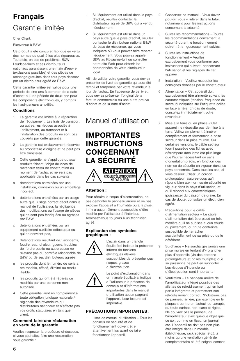 Garantie limitée Cher Client, Bienvenue à B&W. Ce produit a été conçu et fabriqué en vertu des normes de qualité les plus rigoureuses. Toutefois, en cas de problème, B&W Loudspeakers et ses distributeurs nationaux garantissent une main d’œuvre (exclusions possibles) et des pièces de rechange gratuites dans tout pays desservi par un distributeur agréé de B&W. Cette garantie limitée est valide pour une période de cinq ans à compter de la date d’achat ou une période de deux ans pour les composants électroniques, y compris les haut-parleurs amplifiés.