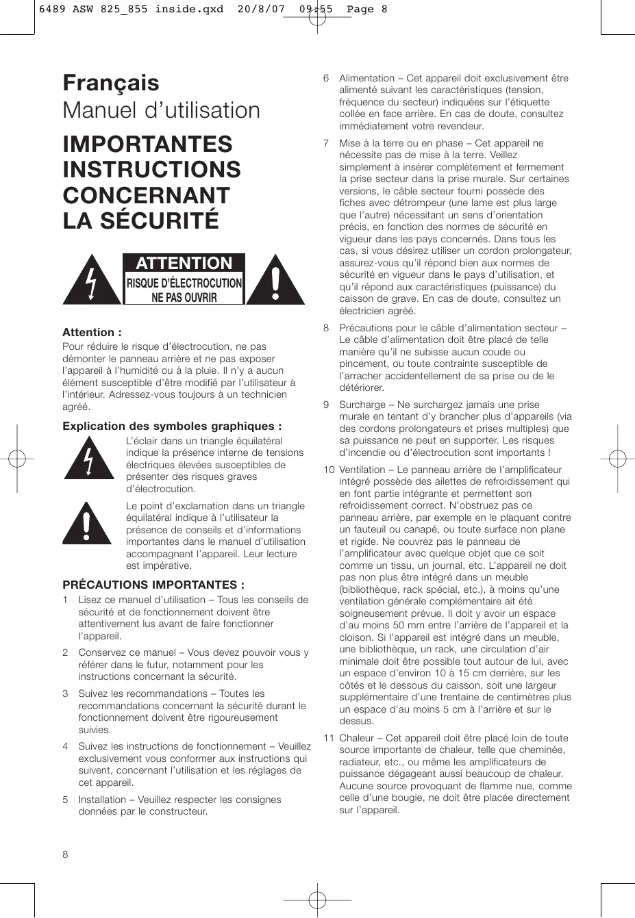 24 Vérifications – Après une quelconque intervention sur l’appareil par un technicien agréé, demandez à ce dernier de procéder à l’ensemble de vérifications nécessaires pour s’assurer du bon fonctionnement de l’appareil. 25 Champs magnétiques – L’appareil peut éventuellement générer un champ magnétique et de l’électricité statique. Ne le placez donc pas à plus de 50 centimètres d’un appareil pouvant être abîmé par ce champ magnétique (tube cathodique de téléviseur, cassettes audio ou vidéo, cartes magnétiques, etc.).
