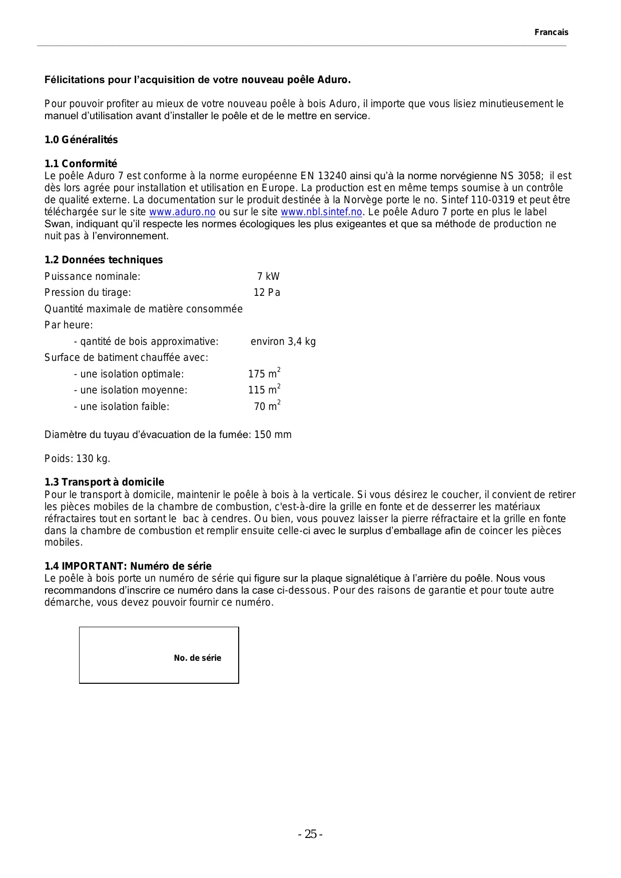 Le poêle à bois porte un numéro de série qui figure sur la plaque signalétique à l’arrière du poêle. Nous vous recommandons d’inscrire ce numéro dans la case ci-dessous. Pour des raisons de garantie et pour toute autre démarche, vous devez pouvoir fournir ce numéro. No. de série