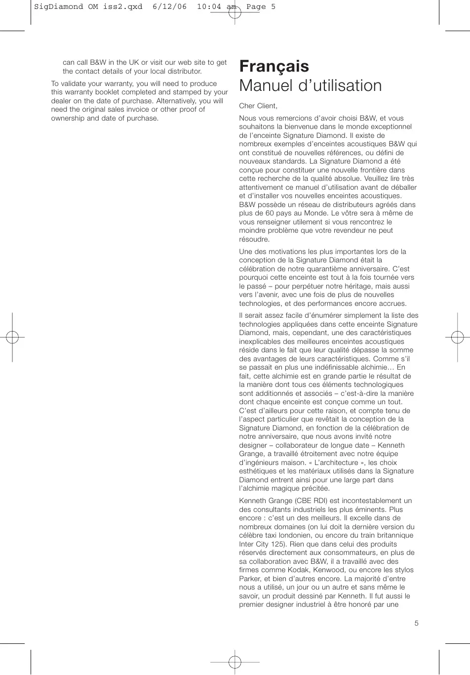 Retrouvez gratuitement la notice de l'appareil B&W SIGNATURE DIAMOND B&W au format PDF.