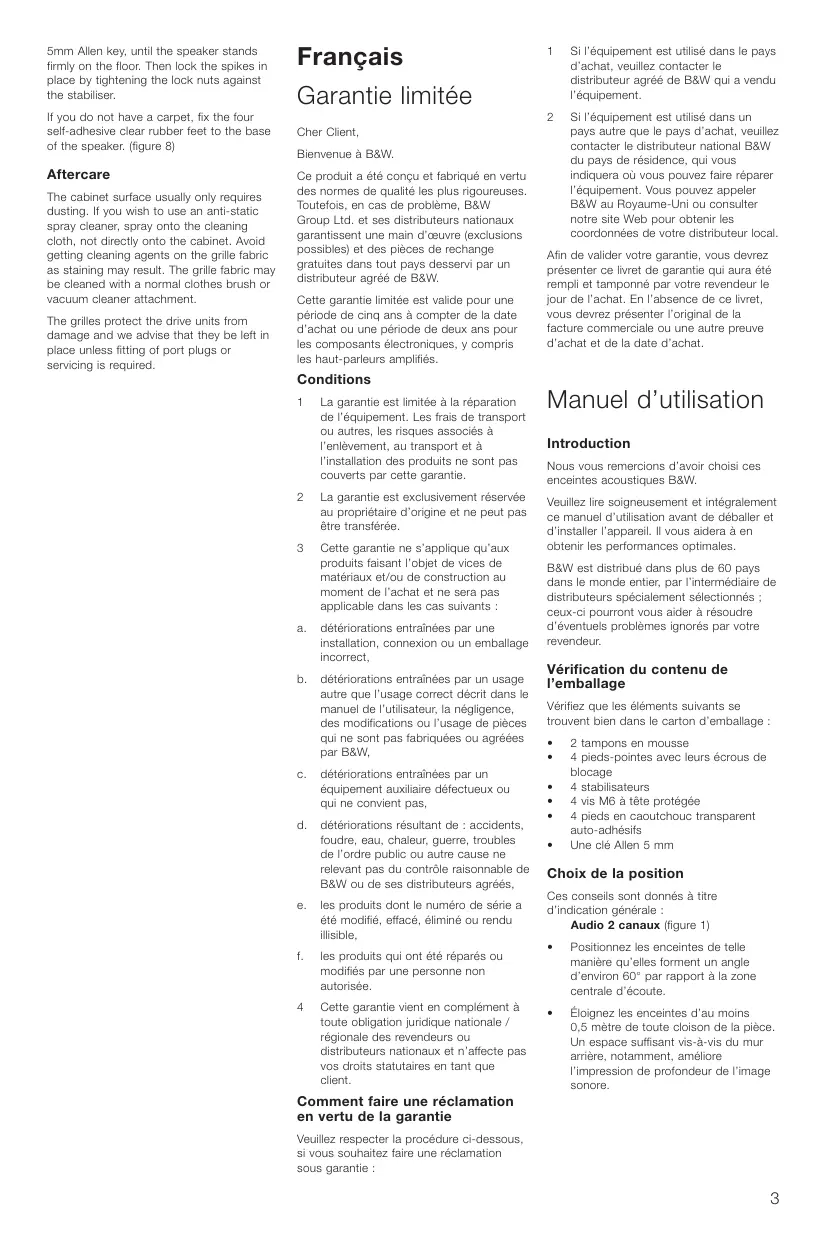 Toutefois, en cas de problème, B&W Group Ltd. et ses distributeurs nationaux garantissent une main d’œuvre (exclusions possibles) et des pièces de rechange gratuites dans tout pays desservi par un distributeur agréé de B&W. Cette garantie limitée est valide pour une période de cinq ans à compter de la date d’achat ou une période de deux ans pour les composants électroniques, y compris les haut-parleurs amplifiés.